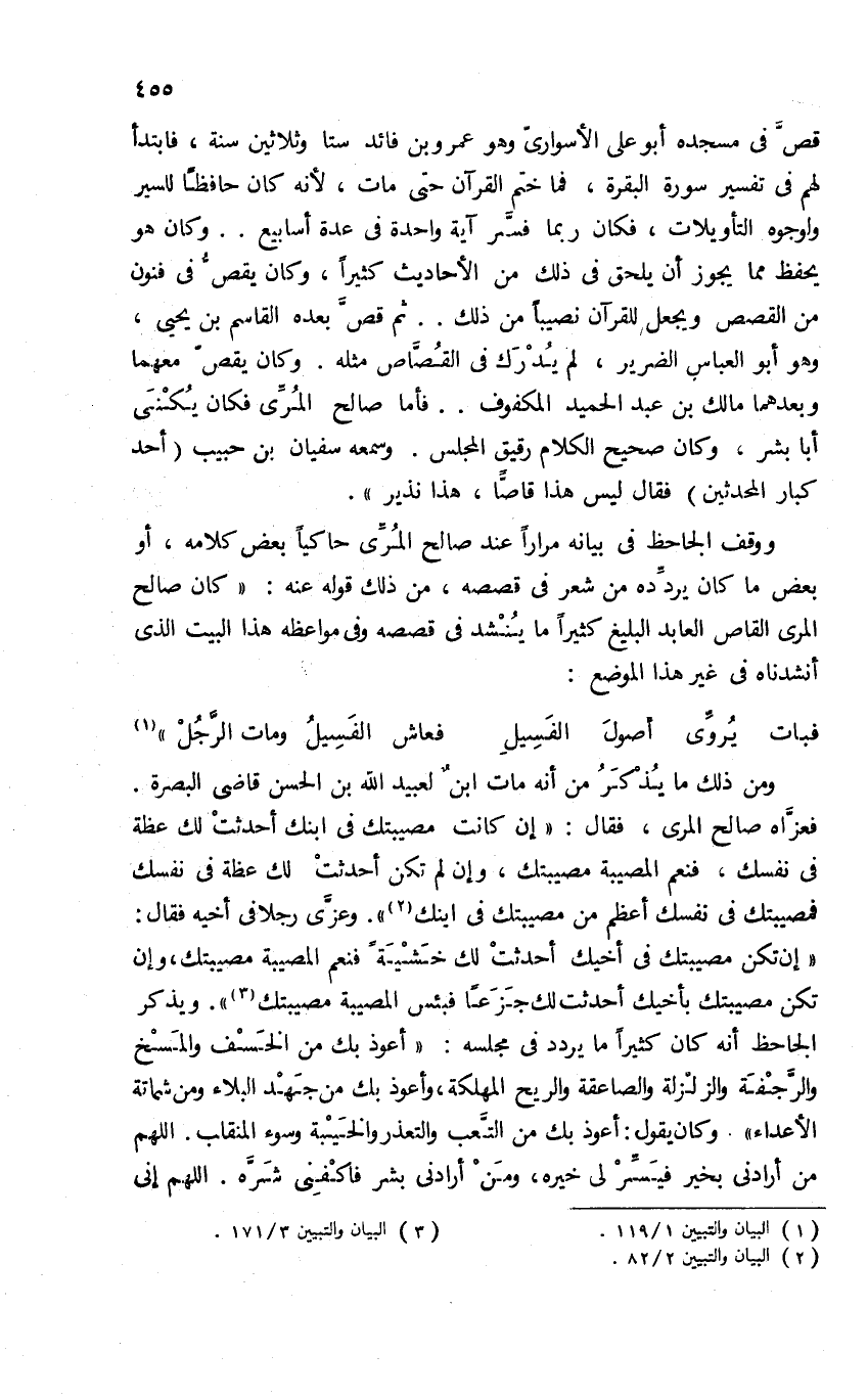 قصّ فى مسجده أبو على الأسوارىّ وهو عمرو بن فائد ستا وثلاثين سنة، فابتدأ لهم فى تفسير سورة البقرة، فما ختم القرآن حتى مات، لأنه كان حافظا للسير ولوجوه التأويلات، فكان ربما فسّر آية واحدة فى عدة أسابيع. . وكان هو يحفظ مما يجوز أن يلحق فى ذلك من الأحاديث كثيرا، وكان يقصّ فى فنون من القصص ويجعل للقرآن نصيبا من ذلك. . ثم قصّ بعده القاسم بن يحيى، وهو أبو العباس الضرير، لم يدرك فى القصّاص مثله. وكان يقصّ معهما وبعدهما مالك بن عبد الحميد المكفوف. . فأما صالح المرّى فكان يكنى أبا بشر، وكان صحيح الكلام رقيق المجلس. وسمعه سفيان بن حبيب (أحد كبار المحدثين) فقال ليس هذا قاصّا، هذا نذير».