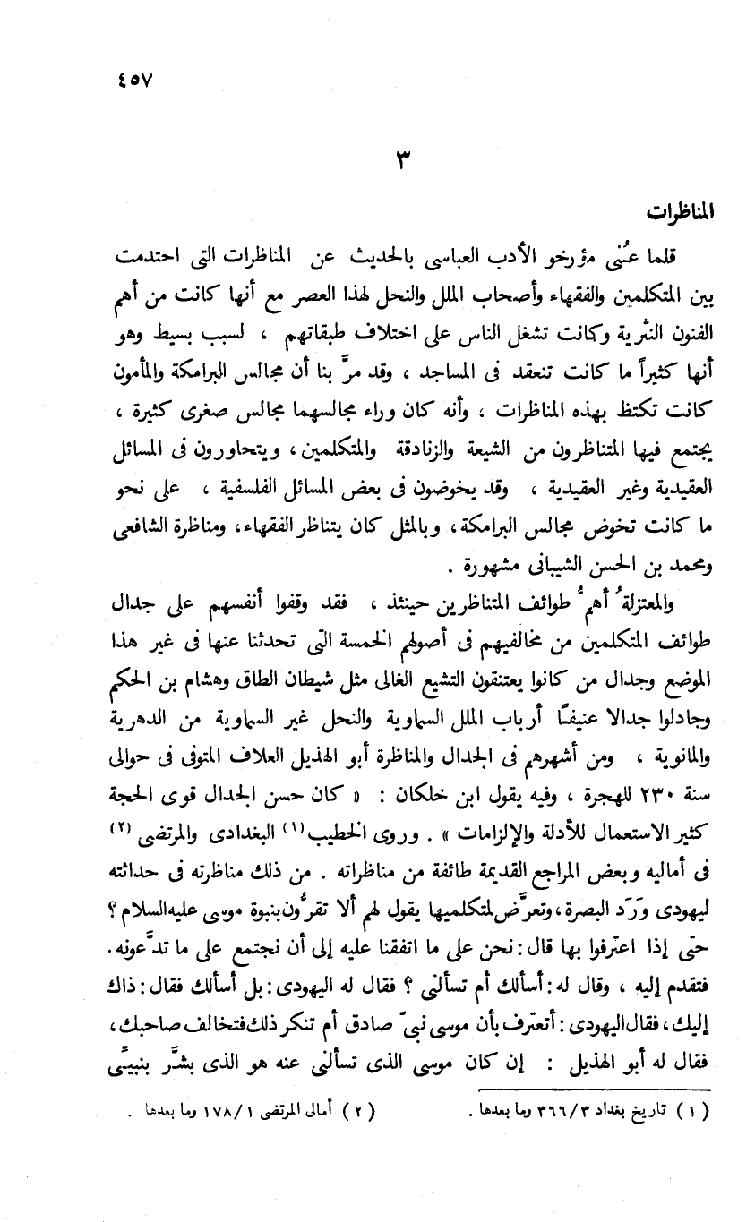 والمعتزلة أهمّ طوائف المتناظرين حينئذ، فقد وقفوا أنفسهم على جدال طوائف المتكلمين من مخالفيهم فى أصولهم الخمسة التى تحدثنا عنها فى غير هذا الموضع وجدال من كانوا يعتنقون التشيع الغالى مثل شيطان الطاق وهشام بن الحكم وجادلوا جدالا عنيفا أرباب الملل السماوية والنحل غير السماوية من الدهرية والمانوية، ومن أشهرهم فى الجدال والمناظرة أبو الهذيل العلاف المتوفى فى حوالى سنة 230 للهجرة، وفيه يقول ابن خلكان: «كان حسن الجدال قوى الحجة كثير الاستعمال للأدلة والإلزامات». وروى الخطيب (¬1) البغدادى والمرتضى (¬2) فى أماليه وبعض المراجع القديمة طائفة من مناظراته. من ذلك مناظرته فى حداثته ليهودى ورد البصرة، وتعرّض لمتكلميها يقول لهم ألا تقرّون بنبوة موسى عليه السلام؟ حتى إذا اعترفوا بها قال: نحن على ما اتفقنا عليه إلى أن نجتمع على ما تدّعونه.