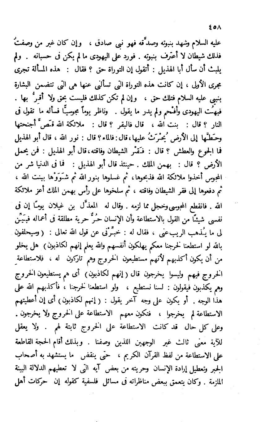 وعلى كل حال قد كانت الاستطاعة على الخروج ثابتة لهم. ولا يعقل للآية معنى ثالث غير الوجهين اللذين وصفنا. وبذلك أقام الحجة القاطعة على الاستطاعة من لفظ القرآن الكريم، حتى ينقض ما يستشهد به أصحاب الجبر وتعطيل إرادة الإنسان وحريته من بعض آيه التى لا تعطيهم الدلالة البينة الملزمة. وكان يتعمق ببعض مناظراته فى مسائل فلسفية كقوله إن حركات أهل