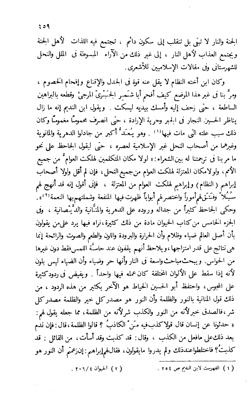 وكان ابن أخته النظام لا يقل عنه قوة فى الجدل والإقناع وإفحام الخصوم، ومرّ بنا فى غير هذا الموضع كيف أفحم أبا شمر الجبرى المرجئ وقطعه بالبراهين الساطعة، حتى زحف إليه وأمسك بيديه ليسكت. ويقول ابن النديم إنه ما زال يناظر الحسين النجار فى الجبر وحرية الإرادة، حتى انصرف محموما مغموما وكان ذلك سبب علته التى مات فيها (¬1). وهو يعدّ أكبر من جادلوا الدهرية والمانوية وغيرهما من أصحاب النحل غير الإسلامية لعصره، حتى ليقول الجاحظ على نحو ما مر بنا فى ترجمتنا له بين الشعراء: «لولا مكان المتكلمين لهلكت العوامّ من جميع الأمم، ولولا مكان المعتزلة لهلكت العوام من جميع النحل، فإن لم أقل ولولا أصحاب إبراهيم (النظام) وإبراهيم لهلكت العوام من المعتزلة، فإنى أقول إنه قد أنهج لهم سبلا وفتق لهم أمورا واختصر لهم أبوابا ظهرت فيها المنفعة وشملتهم بها النعمة (¬2)».