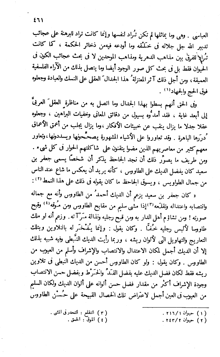 العباسى. وهى وما يماثلها لم تكن تراد لنفسها وإنما كانت تراد للبرهنة على عجائب تدبير الله جل جلاله فى خلقه وما أودعه فيه من ذخائر الحكمة، كما كانت تراه للفرق بين مذاهب الدهرية ومذاهب الموحدين لا فى بحث عجائب الكون فى الحيوان فقط بل فى بحث كل صور الوجود أيضا وما يتصل بذلك من الآراء الفلسفية العميقة، ومن أجل ذلك آثر المعتزلة هذا الجدال العقلى على النسك والعبادة وجعلوه فوق الحج والجهاد (¬1).