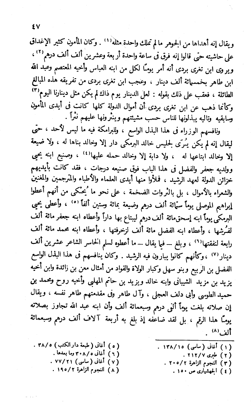 ونافسهم الوزراء فى هذا البذل الواسع، وللبرامكة فيه ما ليس لأحد، حتى ليقال إنه لم يكن يرى لجليس خالد البرمكى دار إلا وخالد بناها له، ولا ضيعة إلا وخالد ابتاعها له، ولا دابة إلا وخالد حمله عليها (¬4)، وصنيع ابنه يحيى وولديه جعفر والفضل فى هذا الباب فوق صنيعه درجات، فقد كانت بأيديهم خزائن الدولة لعهد الرشيد، فملأوا منها أيدى العلماء والأطباء والمترجمين والمغنين والشعراء بالأموال، بل بالثروات الضخمة، على نحو ما يحكى من أنهم أعطوا إبراهيم الموصلى يوما ستمائة ألف درهم وضيعة بمائة وستين ألفا (¬5)، وأعطى يحيى البرمكى يوما ابنه إسحق مائة ألف درهم ليبتاع بها دارا وأعطاه ابنه جعفر مائة ألف لفرشها، وأعطاه ابنه الفضل مائة ألف لزخرفتها، وأعطاه ابنه محمد مائة ألف رابعة لنفقتها (¬6)، وبلغ-فيما يقال-ما أعطوه لسلم الخاسر الشاعر عشرين ألف دينار (¬7)، وكأنهم كانوا يبارون فيه الرشيد. وكان ينافسهم فى هذا البذل الواسع الفضل بن الربيع وبنو سهل وكبار الولاة والقواد من أمثال معن بن زائدة وابن أخيه يزيد بن مزيد الشيبانى وابنه خالد ويزيد بن حاتم المهلبى وأخيه روح ومحمد بن حميد الطوسى وأبى دلف العجلى، وآل طاهر وفى مقدمتهم طاهر نفسه، ويقال إن صلاته بلغت يوما ألفى درهم وسبعمائة ألف وأن ابنه عبد الله تجاوز بصلاته يوما هذا الرقم، بل لقد ضاعفه إذ بلغ به أربعة آلاف ألف درهم وسبعمائة ألف (¬8).