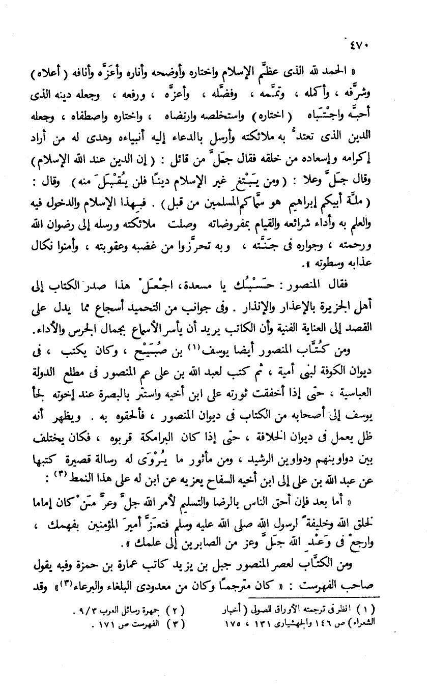 «الحمد لله الذى عظّم الإسلام واختاره وأوضحه وأناره وأعزّه وأنافه (أعلاه) وشرّفه، وأكمله، وتمّمه، وفضّله، وأعزّه، ورفعه، وجعله دينه الذى أحبّه واجتباه (اختاره) واستخلصه وارتضاه، واختاره واصطفاه، وجعله الدين الذى تعتدّ به ملائكته وأرسل بالدعاء إليه أنبياءه وهدى له من أراد إكرامه وإسعاده من خلقه فقال جلّ من قائل: {(إِنَّ الدِّينَ عِنْدَ اللهِ الْإِسْلامُ)} وقال جلّ وعلا: {(وَمَنْ يَبْتَغِ غَيْرَ الْإِسْلامِ دِيناً فَلَنْ يُقْبَلَ مِنْهُ)} وقال: