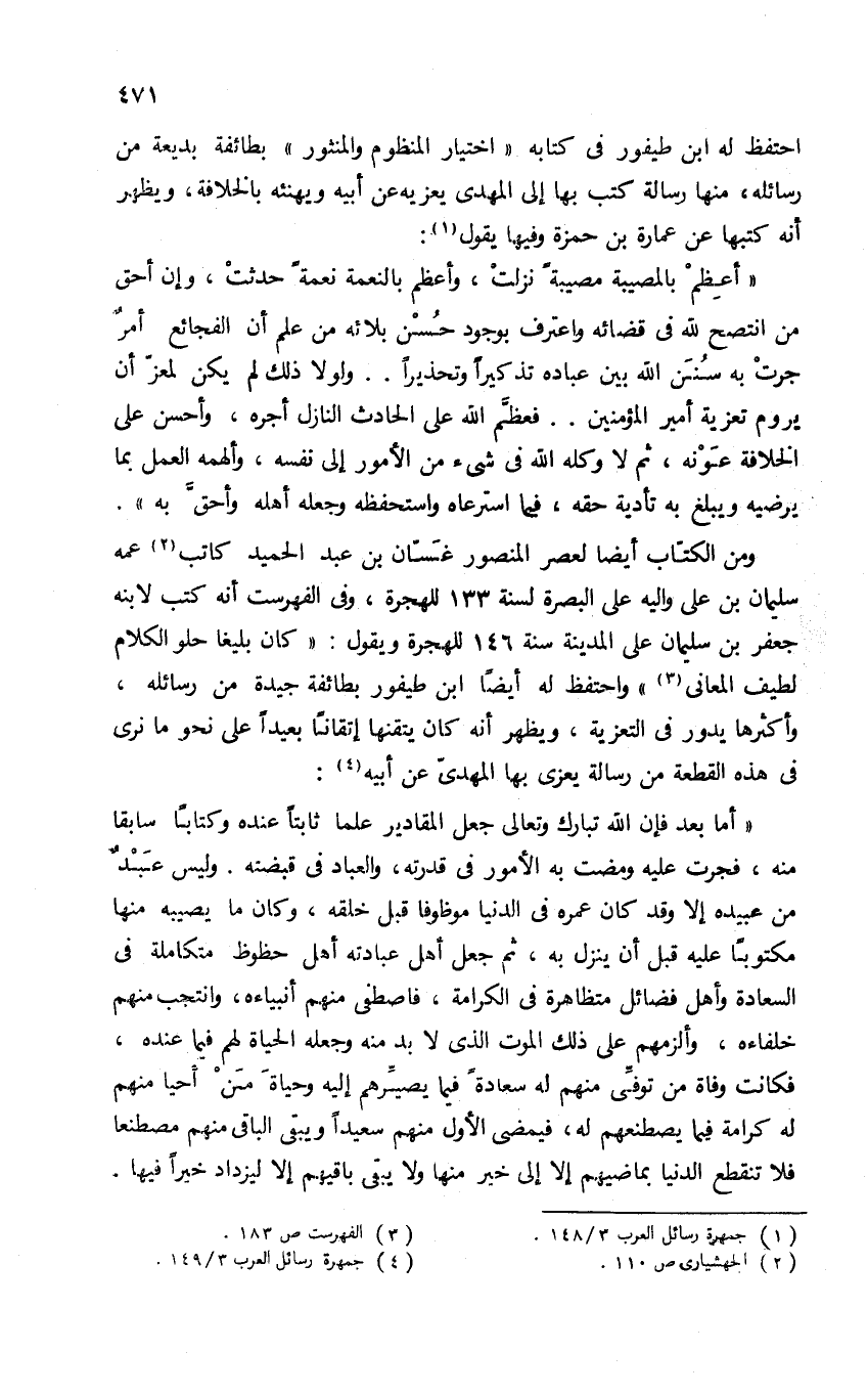 ومن الكتّاب أيضا لعصر المنصور غسّان بن عبد الحميد كاتب (¬2) عمه سليمان بن على واليه على البصرة لسنة 133 للهجرة، وفى الفهرست أنه كتب لابنه جعفر بن سليمان على المدينة سنة 146 للهجرة، ويقول: «كان بليغا حلو الكلام لطيف المعانى (¬3)» واحتفظ له أيضا ابن طيفور بطائفة جيدة من رسائله، وأكثرها يدور فى التعزية، ويظهر أنه كان يتقنها إتقانا بعيدا على نحو ما نرى فى هذه القطعة من رسالة يعزى بها المهدىّ عن أبيه (¬4):