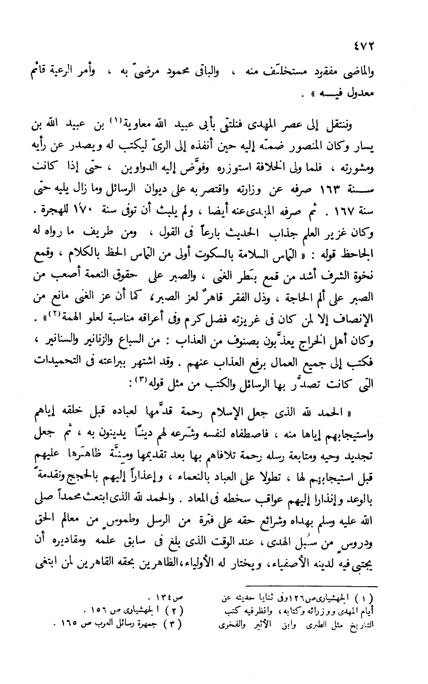 (¬1) الجهشيارى ص 126 وفى ثنايا حديثه عن أيام المهدى ووزرائه وكتابه، وانظر فيه كتب التاريخ مثل الطبرى وابن الأثير والفخرى ص 134.