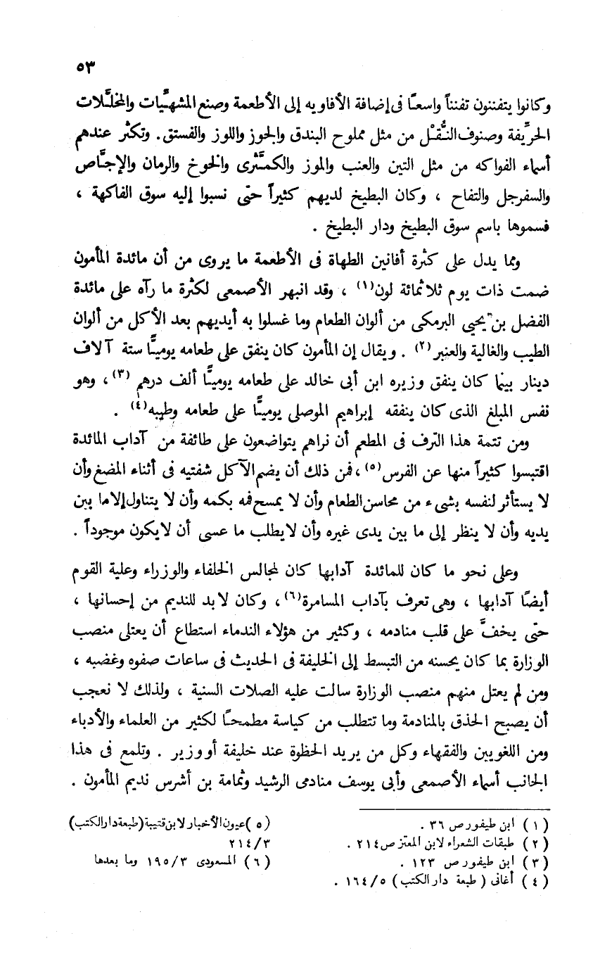 ومما يدل على كثرة أفانين الطهاة فى الأطعمة ما يروى من أن مائدة المأمون ضمت ذات يوم ثلاثمائة لون (¬1)، وقد انبهر الأصمعى لكثرة ما رآه على مائدة الفضل بن يحيى البرمكى من ألوان الطعام وما غسلوا به أيديهم بعد الأكل من ألوان الطيب والغالية والعنبر (¬2). ويقال إن المأمون كان ينفق على طعامه يوميّا ستة آلاف دينار بينما كان ينفق وزيره ابن أبى خالد على طعامه يوميّا ألف درهم (¬3)، وهو نفس المبلغ الذى كان ينفقه إبراهيم الموصلى يوميّا على طعامه وطيبه (¬4).