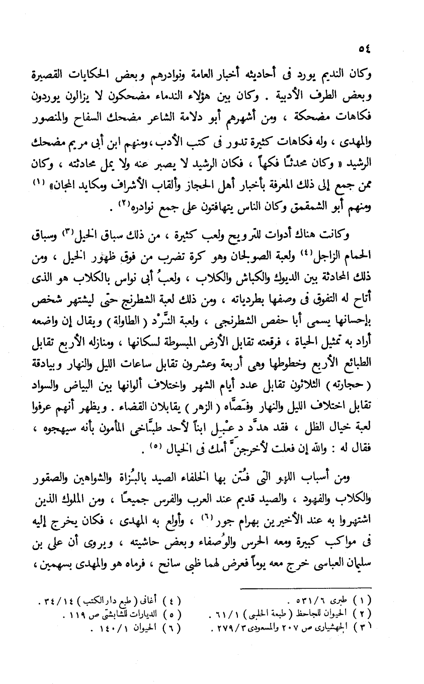 وكانت هناك أدوات للتراويح ولعب كثيرة، من ذلك سباق الخيل (¬3) وسباق الحمام الزاجل (¬4) ولعبة الصولجان وهو كرة تضرب من فوق ظهور الخيل، ومن ذلك المحادثة بين الديوك والكباش والكلاب، ولعب أبى نواس بالكلاب هو الذى أتاح له التفوق فى وصفها بطردياته، ومن ذلك لعبة الشطرنج حتى ليشتهر شخص بإحسانها يسمى أبا حفص الشطرنجى، ولعبة النّرد (الطاولة) ويقال إن واضعه أراد به تمثيل الحياة، فرقعته تقابل الأرض المبسوطة لسكانها، ومنازله الأربع تقابل الطبائع الأربع وخطوطها وهى أربعة وعشرون تقابل ساعات الليل والنهار وبيادقة (حجارته) الثلاثون تقابل عدد أيام الشهر واختلاف ألوانها بين البياض والسواد تقابل اختلاف الليل والنهار وفصّاه (الزهر) يقابلان القضاء. ويظهر أنهم عرفوا لعبة خيال الظل، فقد هدّد دعبل ابنا لأحد طبّاخى المأمون بأنه سيهجوه، فقال له: والله إن فعلت لأخرجنّ أمك فى الخيال (¬5).