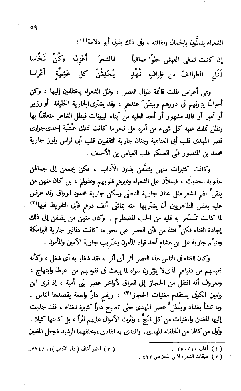 وهى أعراس ظلت قائمة طوال العصر، وظل الشعراء يختلفون إليها، وكن أحيانا يزرنهم فى دورهم ويبتن عندهم، وقد يشترى الجارية الخليفة أو وزير أو أمير أو قائد مشهور أو أحد العلية من أبناء البيوتات فيظل الشاعر متعلقا بها وتظل تملك عليه كل شئ من أمره على نحو ما كانت تملك عتبة إحدى جوارى قصر المهدى قلب أبى العتاهية وجنان جارية الثقفيين قلب أبى نواس وفوز جارية محمد بن المنصور فتى العسكر قلب العباس بن الأحنف.