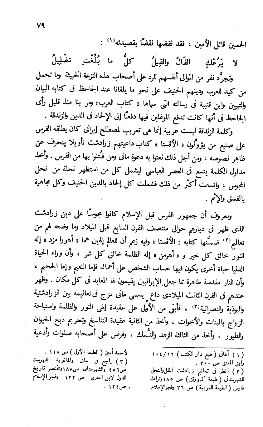 (¬2) انظر فى تعاليم زرادشت الملل والنحل للشهرستانى (طبعة كيورتن) ص 185 وتراث فارس (الطبعة العربية) ص 36 وفجر الإسلام لأحمد أمين (الطبعة الأولى) ص 118.