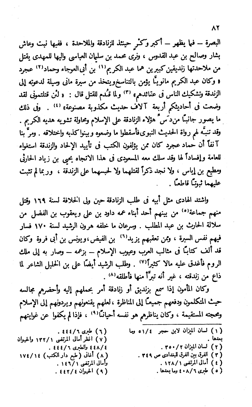 واشتد الهادى مثل أبيه فى طلب الزنادقة حين ولى الخلافة لسنة 169 وقتل منهم جماعة (¬5) من بينهم أحد أبناء عمه داود بن على ويعقوب بن الفضل من سلالة الحارث بن عبد المطلب. وسرعان ما خلفه هرون الرشيد لسنة 170 فسار فيهم نفس السيرة، وممن تعقبهم يزيد (¬6) بن الفيض، ويونس بن أبى فروة وكان قد ألف كتابا فى مثالب العرب وعيوب الإسلام-بزعمه-وصار به إلى ملك الروم فأغدق عليه مالا كثيرا (¬7). وطلب الرشيد أيضا على بن الخليل الشاعر لما ذاع من زندقته، غير أنه تبرّأ منها فأطلقه (¬8).