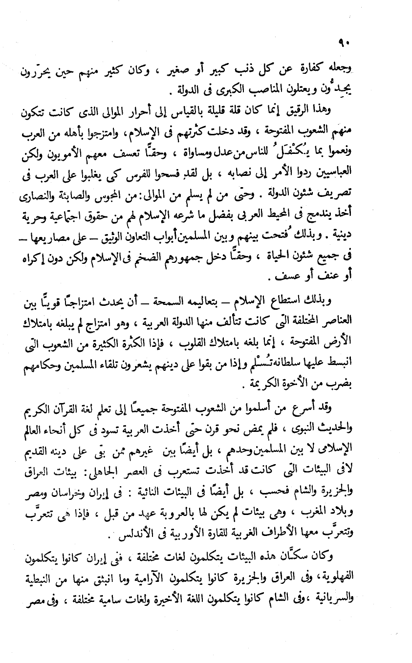 وهذا الرقيق إنما كان قلة قليلة بالقياس إلى أحرار الموالى الذى كانت تتكون منهم الشعوب المفتوحة، وقد دخلت كثرتهم فى الإسلام، وامتزجوا بأهله من العرب ونعموا بما يكفل للناس من عدل ومساواة، وحقّا تعسف معهم الأمويون ولكن العباسيين ردوا الأمر إلى نصابه، بل لقد فسحوا للفرس كى يغلبوا على العرب فى تصريف شئون الدولة. وحتى من لم يسلم من الموالى: من المجوس والصابئة والنصارى أخذ يندمج فى المحيط العربى بفضل ما شرعه الإسلام لهم من حقوق اجتماعية وحرية دينية. وبذلك فتحت بينهم وبين المسلمين أبواب التعاون الوثيق-على مصاريعها- فى جميع شئون الحياة، وحقّا دخل جمهورهم الضخم فى الإسلام ولكن دون إكراه أو عنف أو عسف.
