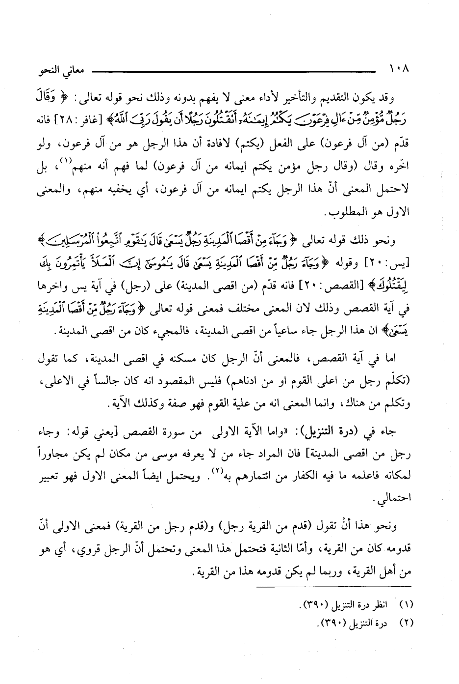ونحو ذلك قوله تعالى: {وجاء من أقصا المدينة رجل يسعى قال ياقوم اتبعوا المرسلين} [يس: 20]، وقوله: {وجاء رجل من أقصا المدينة يسعى قال يا يموسى إن الملأ يأتمرون بك ليقتلوك} [القصص: 20]، فإنه قدم (من أقصى المدينة) على (رجل) في آية يس وآخرها في آية القصص وذلك لأن المعنى مختلف فمعنى قوله تعالى {وجاء رجل من أقصا المدينة يسعى} إن هذا الرجل جاء ساعيا من أقصى المدينة، فالمجيء كان من أقصى المدينة.