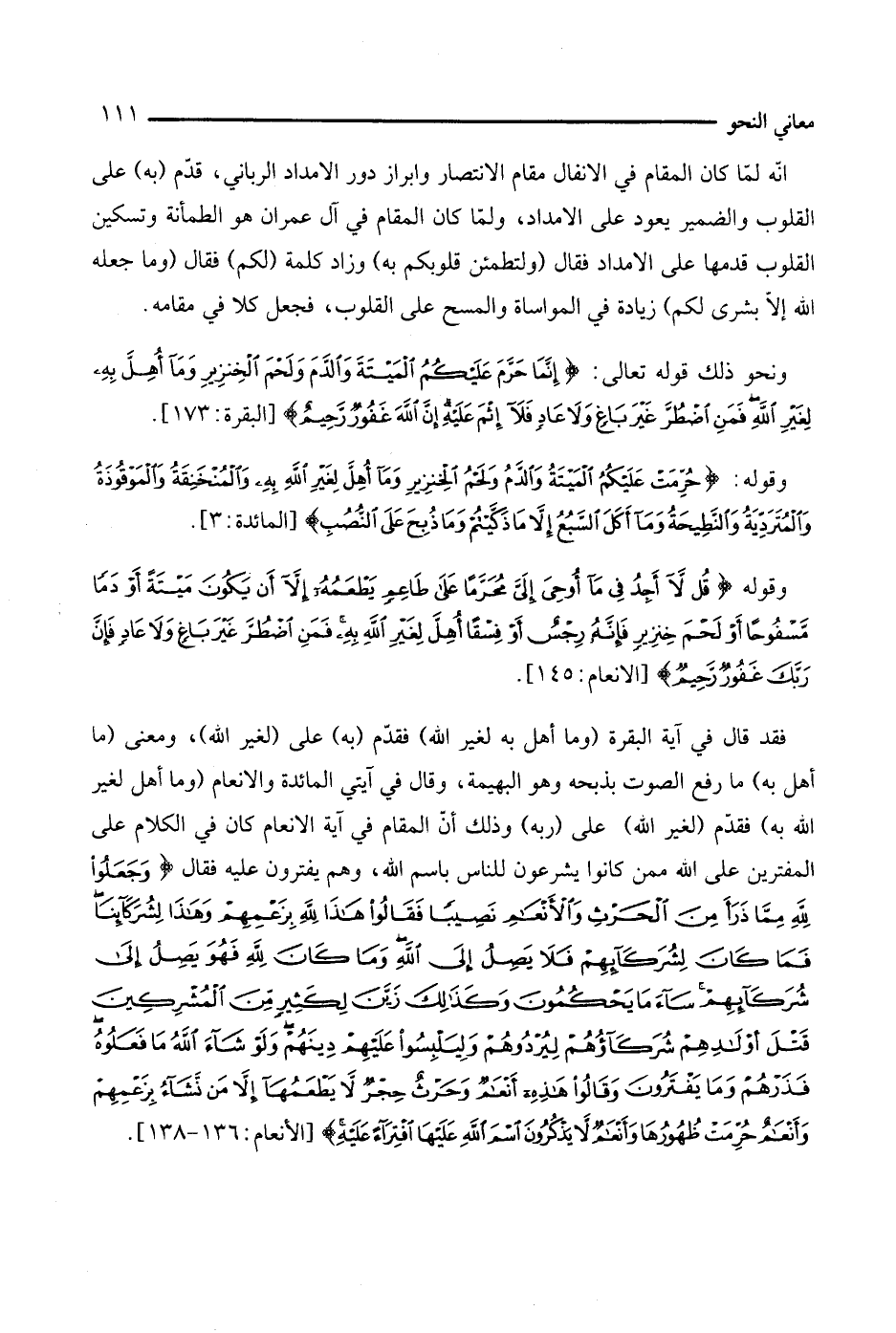 فقد قال في آية البقرة (وما أهل به لغير الله) فقدم (به) على (لغير الله) ومعنى (ما أهل به) ما رفع الصوت بذبحه وهو البهيمة، وقال في آيتي المائدة والأنعام (وما أهل لغير الله به) فقدم (لغير الله) على (ربه) وذلك أن المقام في آية الانعام كان في الكلام على المفترين على الله ممن كانوا يشرعون للناس باسم الدين، وهم يفترون عليه فقال {وجعلوا لله مما ذرأ من الحرث والأنعام نصيبا فقالوا هذا لله بزعمهم وهذا لشركائنا فما كان لشركائهم فلا يصل إلى الله وما كان لله فهو يصل إلى شركائهم ساء ما يحكمون وكذلك زين لكثير من المشركين قتل أولادهم شركاؤهم ليردوهم وليلبسوا عليهم دينهم ولو شاء الله ما فعلوه فذرهم وما يفترون وقالوا هذه أنعام وحرث حجر لا يطعمها إلا من نشاء بزعمهم وأنعام حرمت ظهورها وأنعام لا يذكرون اسم الله عليها افتراء عليه} [الأنعام: 136 - 138].