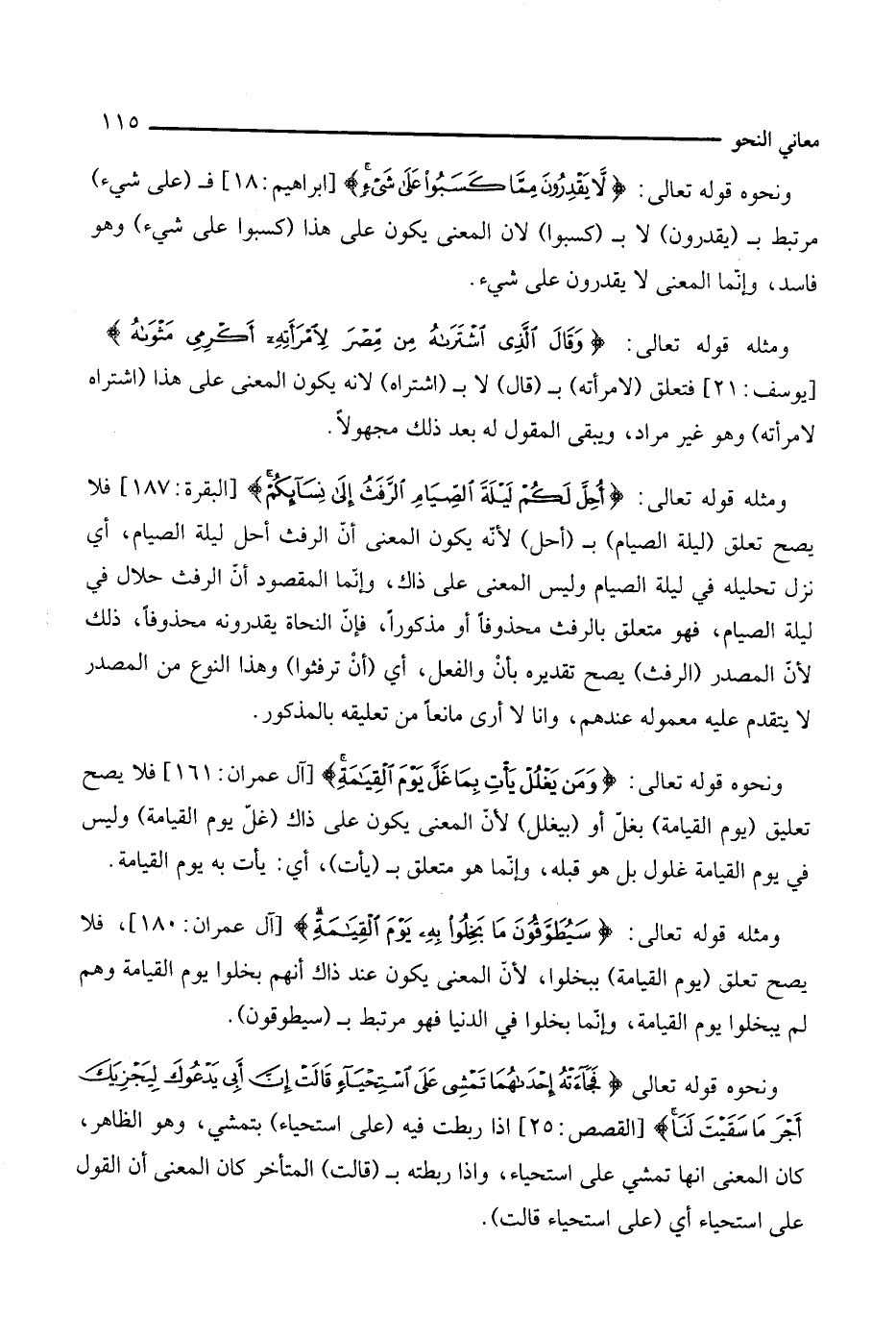 ونحوه قوله تعالى: {لا يقدرون مما كسبوا على شيء} [إبراهيم: 18]، فـ (على شيء) مرتبط بـ (يقدرون) لا بـ (كسبوا) لأن المعنى يكون على هذا كسبوا على شيء، وهو فاسد، وإنما المعنى لا يقدرون على شيء.
