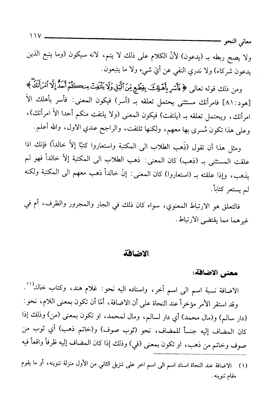 (¬1) الإضافة عند النحاة اسناد اسم إلى اسم آخر على تنزيل الثاني من الأول منزلة تنوينه أو ما يقوم مقام تنوينه.