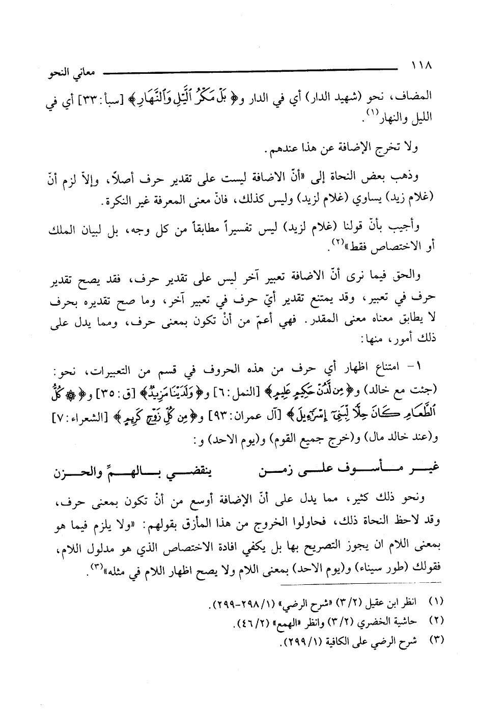 ونحو ذلك كثير، مما يدل على أن الإضافة أوسع من أن تكون بمعنى حرف، وقد لاحظ النحاة ذلك، فحاولوا الخروج من هذا المأزق بقولهم: " ولا يلزم فيما هو بمعنى اللام أن يجوز التصريح بها بل يكفي إفادة الاختصاص الذي هو مدلول اللام، فقولك (طور سيناء) و (يوم الأحد) بمعنى اللام ولا يصح إظهار اللام في مثله (¬3).