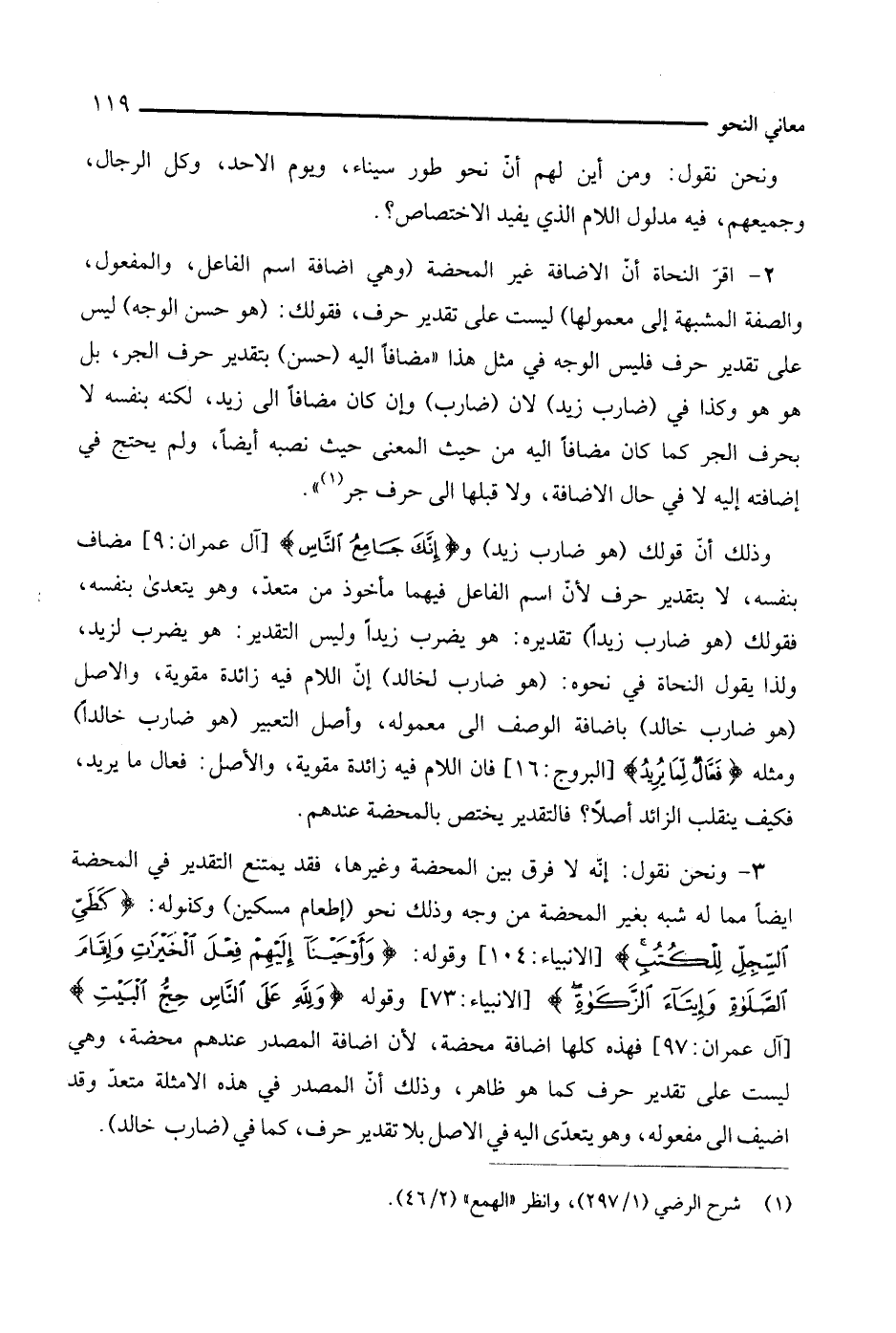 وذلك أن قولك (هو ضارب زيد) و {إنك جامع الناس} [آل عمران: 9]، مضاف بنفسه، لا بتقدر حرف لأن اسم الفاعل فيهما مأخوذ من متعد، وهو يتعدي بنفسه، فقولك (هو ضارب زيدا) تقديره: هو يضرب زيدا وليس التقدير: هو يضرب لزيد ولذا يقول النحاة في نحوه: (هو ضارب لخالد) إن اللام فيه زائدة مقوية، والأصل (هو ضارب خالد) بإضافة الوصف إلى معموله، وأصل التعبير (هو ضارب خالدا) ومثله {فعال لما يريد} [البروج: 16]ـ، فإن اللام فيه زائدة مقوية، والأصل: فعال ما يريد، فكيف ينقلب الزائد اصلا؟ فالتقدير يختص بالمحضة عندهم.