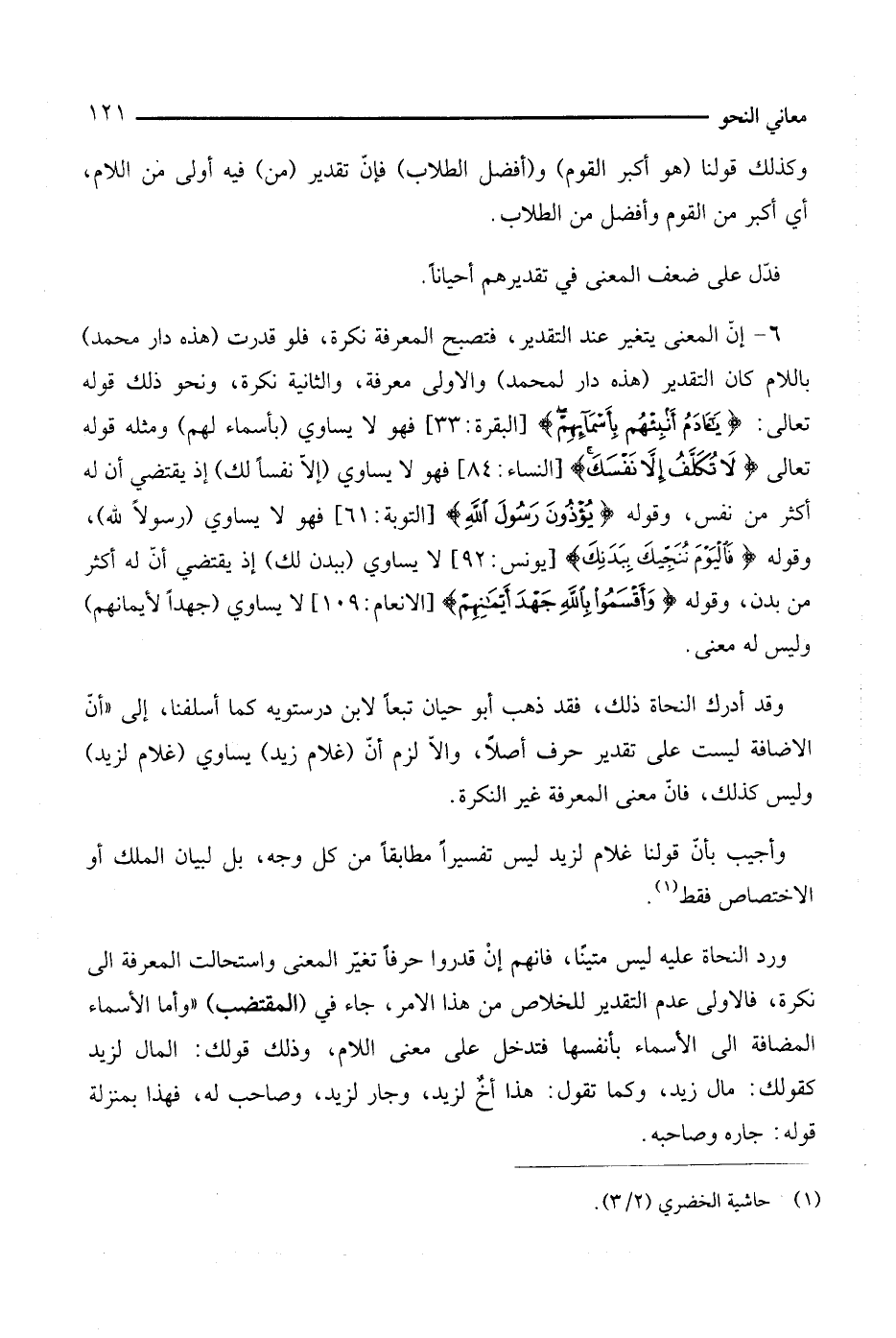 6 - أن المعنى يتغير عند التقدير، فتصبح المعرفة نكرة، فلو قدرت (هذه دار محمد) باللام كان التقدير (هذه دار لمحمد) والأولى معرفة، والثانية نكرة، ونحو ذلك قوله تعالى: {يآدم أنبئهم بأسمائهم} [البقرة: 33]، فهو لا يساوي (بأسماء لهم) ومثله قوله تعالى: {لا تكلف إلا نفسك} [النساء: 84]، فهو لا يساوي (إلا نفسًا لك) إذ يقتضي أن له أكثر من نفس، وقوله: {يؤذن رسول الله} [التوبة: 61]، فهو لا يساوي (رسولا لله) وقوله {فاليوم ننجيك ببدنك} [يونس: 92]، لا يساوي (ببدن لك) إذ يقتضي أن له أكثر من بدن، وقوله: {وأقسموا بالله جهد أيمانهم} [الأنعام: 109]، لا يساوي (جهدا لأيمانهم) وليس له معنى.