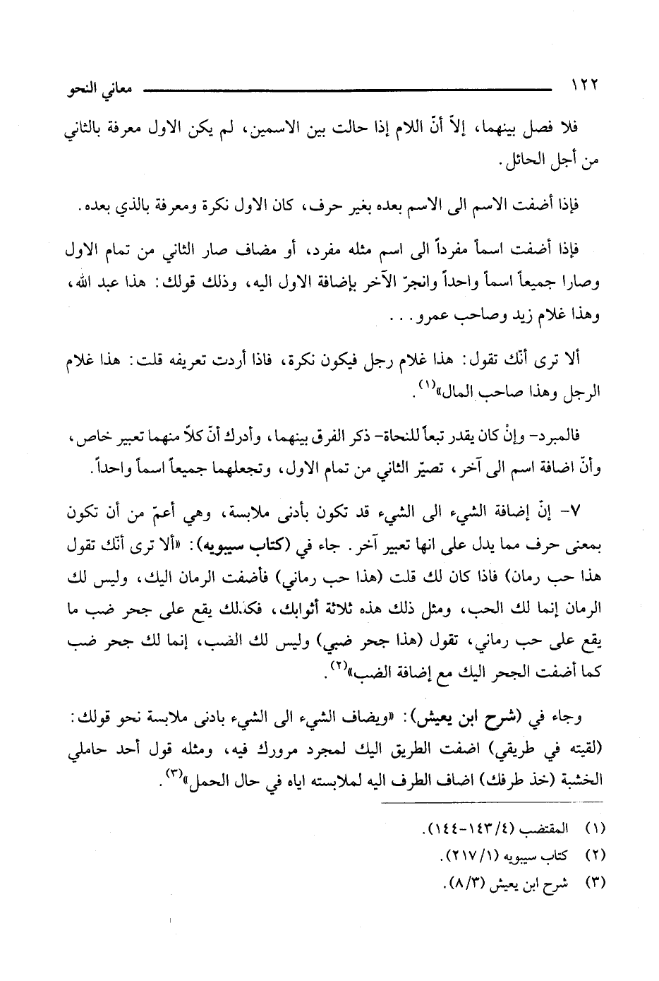 فإذا أضفت اسما مفردا إلى اسم مثله مفرد، أو مضاف صار الثاني من تمام الأول وصارا جميعا اسما واحدا وانجر الآخر بإضافة الأول إليه، وذلك قولك: هذا عبد الله، وهذا غلام زيد وصاحب عمرو ..