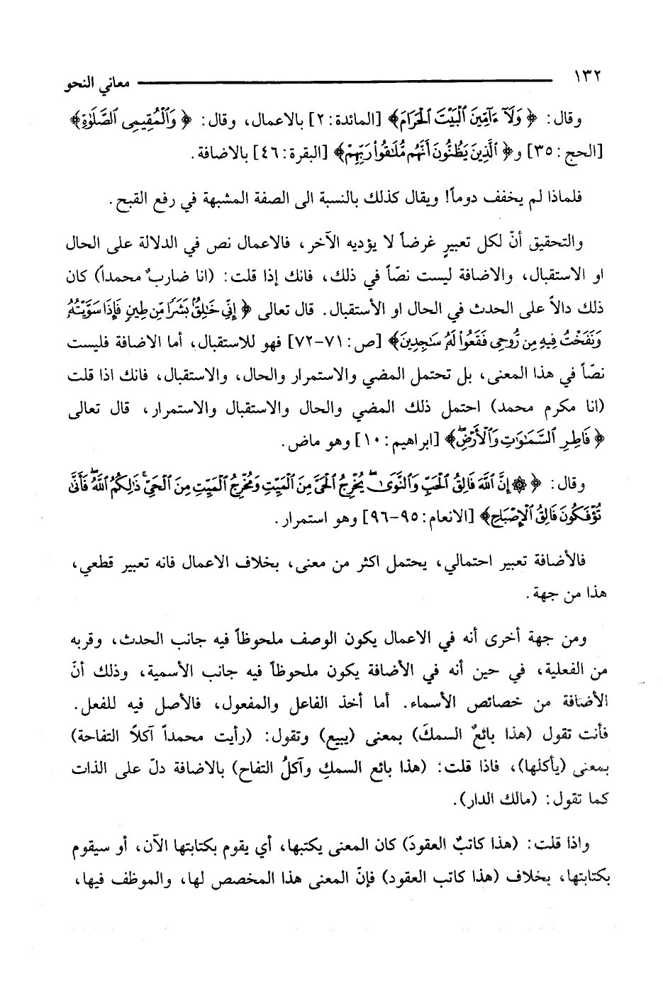والتحقيق أن لكل تعبير غرضا لا يؤديه الآخر، فالأعمال نص في الدلالة على الحال أو الاستقبال، والإضافة ليست نصا في ذلك، فإنك إذا قلت: (أنا ضارب محمدا) كان ذلك دالا على الحدث في الحال أو الاستقبال، قال تعالى: {إني خالق بشرا من طين فإذا سويته ونفخت فيه من روحي فقعوا له ساجدين} [ص: 71 - 72]، فهو للاستقبال، أما الإضافة فليست نصا في هذا المعنى، بل تحتمل المضي والاستمرار والحال، والاستقبال، فإنك إذا قلت (أنا مكرم محمد) احتمل ذلك المضي والحال والاستقبال والاستمرار قال تعالى {فاطر السماوات والأرض} [إبراهيم: 10]، وهو ماض.