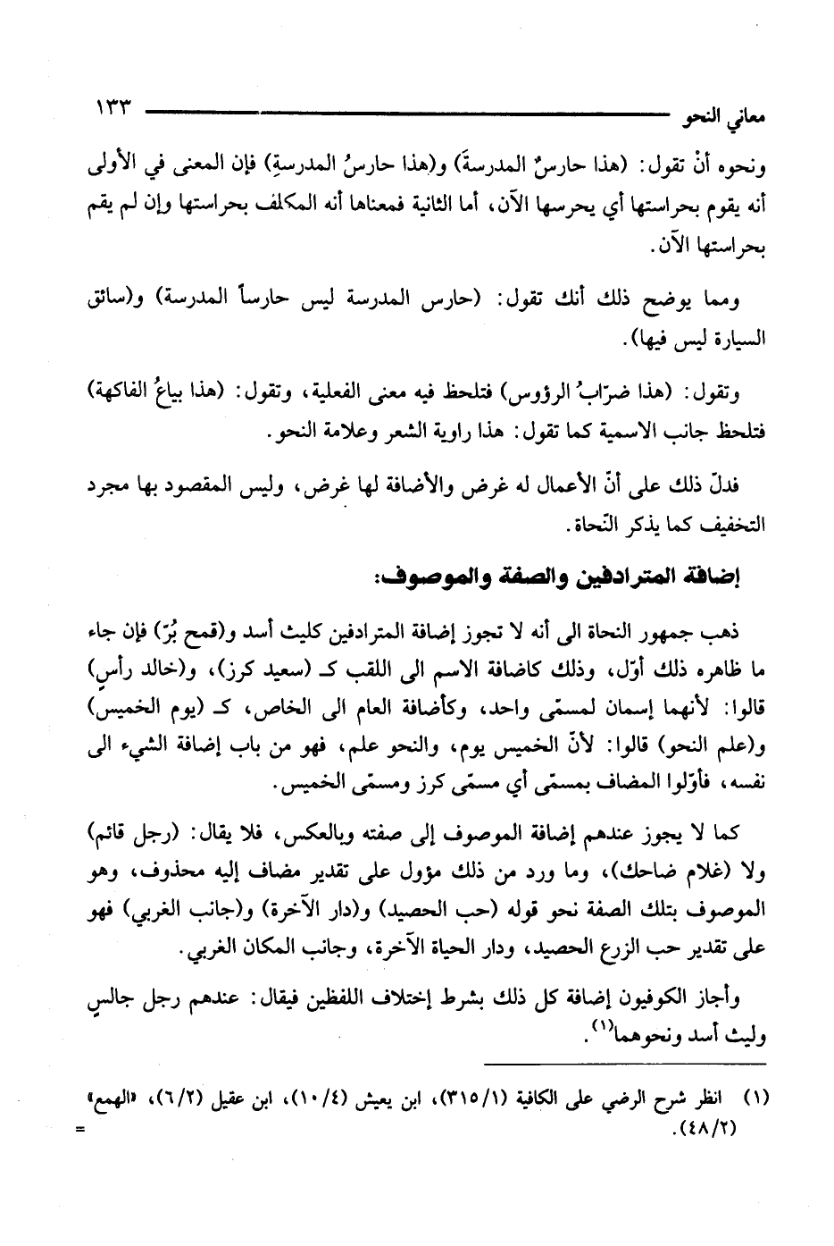 كما لا يجوز عندهم إضافة الموصوف إلى صفته وبالعكس، فلا يقال: (رجل قائم) ولا (غلام ضاحك)، وما ورد من ذلك مؤول على تقدير مضاف إليه محذوف، وهو الموصوف بتلك الصفة نحو قوله (حب الحصيد) و (دار الآخرة) و (جانب الغربي) فهو على تقدير حب الزرع الحصيد، ودار الحياة الآخرة، وجانب المكان الغربي.