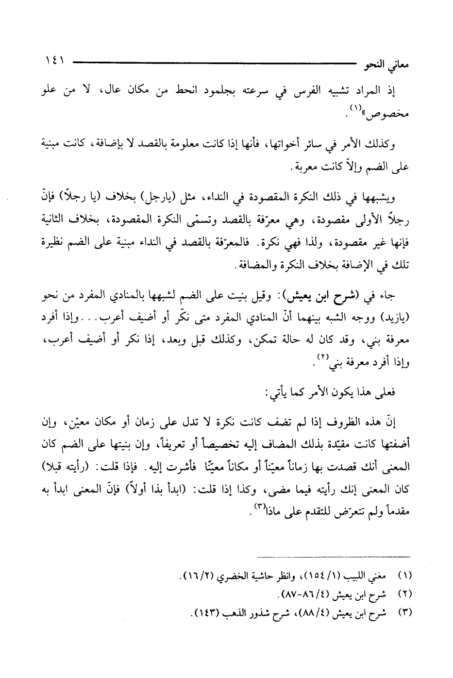 إن هذه الظروف إذا لم تضف كانت نكرة لا تدل على زمان أو مكان معين، وإن أضفتها كانت مقيدة بذلك المضاف إليه تخصيصا أو تعريفا، وإن بنيتها على الضم كان المعنى أنك قصدت بها زمانا معينا أو مكانا معينا فأشرت إليه. فإذا قلت: {رأيته قبلا} كان المعنى إنك رأيته فيما مضى، وكذا إذا قلت: (أبدا بذا أولا) فإن المعنى أبدًا به مقدمًا ولم تتعرض للتقدم على ماذا (¬3).