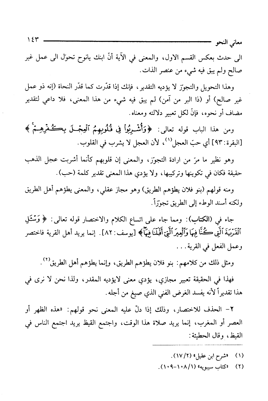 جاء في (الكتاب): ومما جاء على اتساع الكلام والاختصار قوله تعالى: {وسئل القرية التي كنا فيها والعير التي اقبلنا فيها} [يوسف: 82]، إنما يريد أهل القرية فاختصر وعمل الفعل في القرية ..