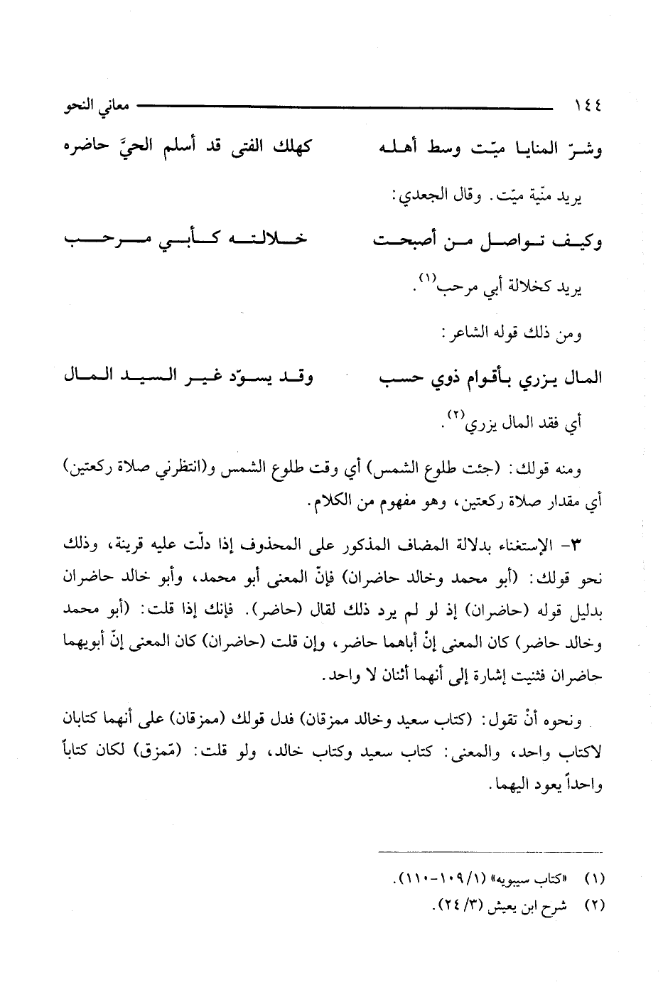 3 - الاستغناء بدلالة المضاف المذكور على المحذوف إذا دلت عليه قرينة، وذلك نحو قولك: (أبو محمد وخالد حاضران) فإن المعنى أبو محمد، وأبو خالد حاضران بدليل قوله (حاضران) إذ لو لم يرد ذلك لقال (حاضر). فإنك إذا قلت: (أبو محمد وخالد حاضر)، كان المعنى أن أباهما حاضر، وإن قلت (حاضران) كان المعنى إن أبويهما حاضران فثنيت إشارة إلى أنهما أثنان لا واحد.