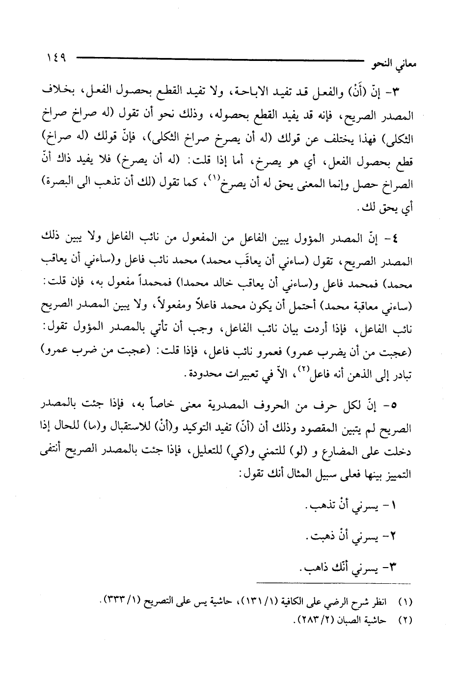 3 - إن (أَنْ) والفعل قد تفيد الإباحة، ولا تفيد القطع بحصول الفعل، بخلاف المصدر الصريح، فإنه قد يفيد القطع بحصوله، وذلك نحو أن تقول: (له صراخ صراخ الثكلى) فهذا يختلف عن قولك: (له أن يصرخ صراخ الثكلى) فإن قولك (له صراخ) قطع بحصول الفعل، أي هو يصرخ، أما إذا قلت: (له أن يصرخ) فلا يفيد ذاك أن الصراخ حصل وإنما المعنى يحق له أن يصرخ (¬1). كما تقول (لك أن تذهب إلى البصرة) أي يحق لك.