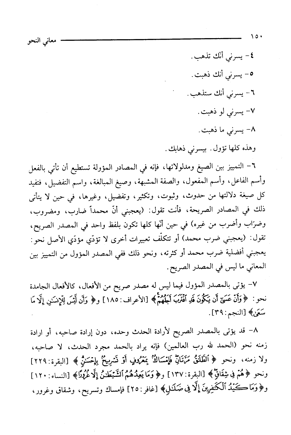 8 - قد يؤتى بالمصدر الصريح لإرادة الحدث وحده، دون إرادة صاحبه، أو إرادة زمنه نحو (الحمد لله رب العالمين) فإنه يراد بالحمد مجرد الحدث، لا صاحبه، ولا زمنه، ونحو: (الطلاق مرتان فإمساك بمعروف أو تسريح بإحسان) [البقرةك 229]، ونحو: {وهم في شقاق} [البقرة: 137]، و {ما يعدهم الشيطان إلا غرورا} [النساء: 120]، و {وما كيد الكافرين إلا في ضلال} [غافر: 25]} فإمساك وتسريح، وشقاق وغرور،