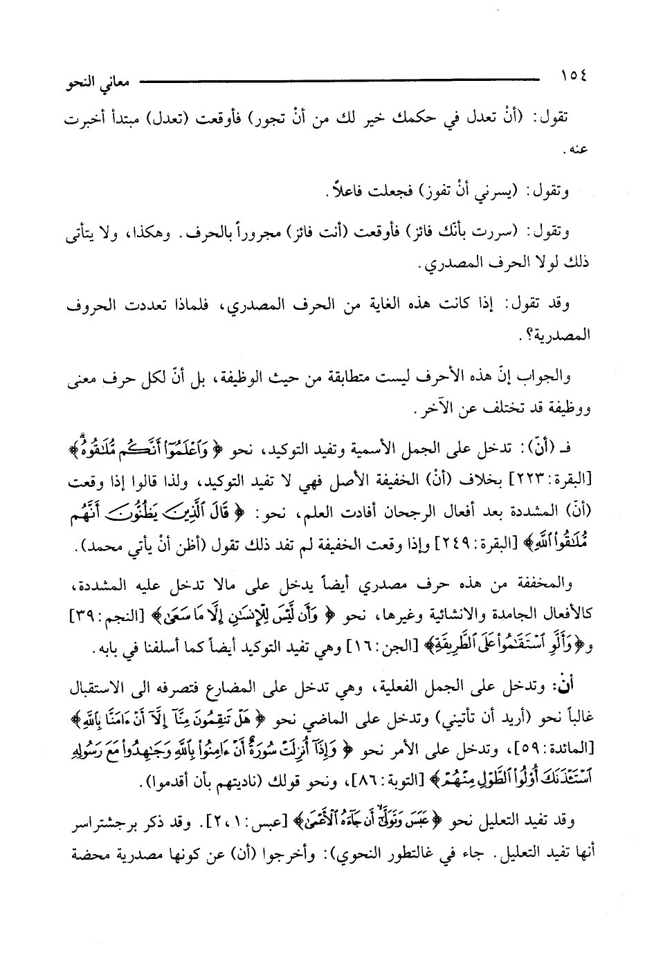 فـ أن: تدخل على الجمل الإسمية وتفيد التوكيد، نحو: {واعلموا أنكم ملاقوه} [البقرة: 223]، بخلاف أن الخفيفة الأصل فهي لا تفيد التوكيد، ولذا قالوا إذا وقعت أن المشددة بعد أفعال الرجحان أفادت العلم، نحو: {قال الذين يظنون أنهم ملاقوا الله} [البقرة: 249]، وإذا وقعت الخفيفة لم تفد ذلك تقول (أظن أن يأتي محمد).