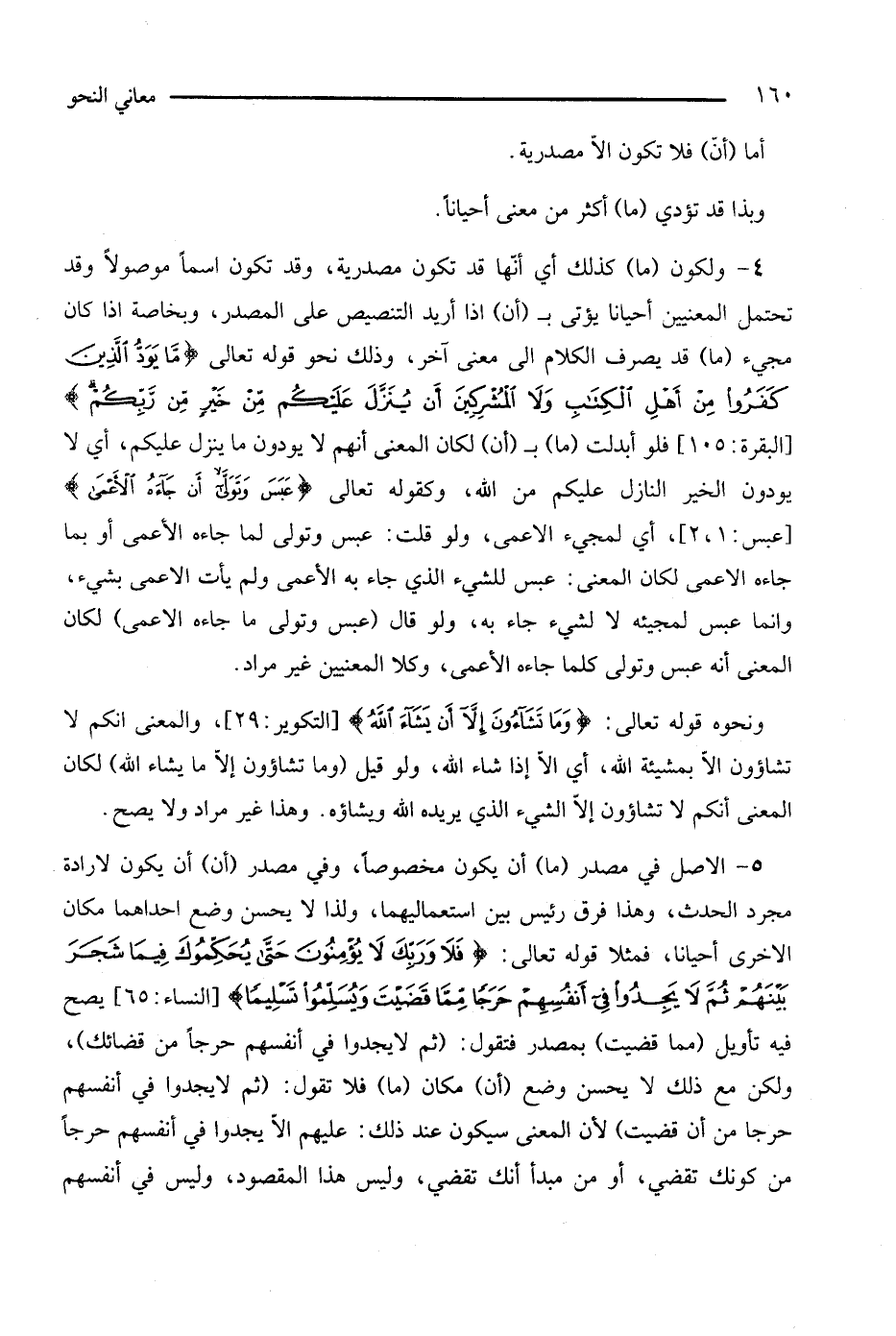 4 - ولكون (ما) كذلك أي أنها قد تكون مصدرية، وقد تكون اسما موصولا وقد تحتمل المعنيين أحيانا يؤتى بـ (أن) إذا أريد التنصيص على المصدر، وبخاصة إذا كان مجيء (ما) قد يصرف الكلام إلى معنى آخر، وذلك نحو قوله تعالى: {ما يود الذين كفروا من أهل الكتاب ولا المشركين أن ينزل عليكم من خير من ربكم} [البقرة: 105]، فلو أبدلت (ما) بـ (أن) لكان المعنى أنهم لا يودون ما ينزل عليكم، أي لا يودون الخير النازل عليكم من الله، وكقوله تعالى: {عبس وتولى أن جاءه الأعمى} [عبس: 1، 2]، أي لمجيء الأعمى، ولو قلت: عبس وتولى لما جاءه الأعمى أو بما جاءه الأعمى لكان المعنى: عبس للشيء الذي جاء به الأعمى ولم يأت الأعمى بشيء، وإنما عبس لمجيئه لا لشيء جاء به، ولو قال (عبس وتولى ما جاءه الأعمى)، لكان المعنى أنه عبس وتولى كلما جاءه الأعمى، وكلا المعنيين غير مراد.