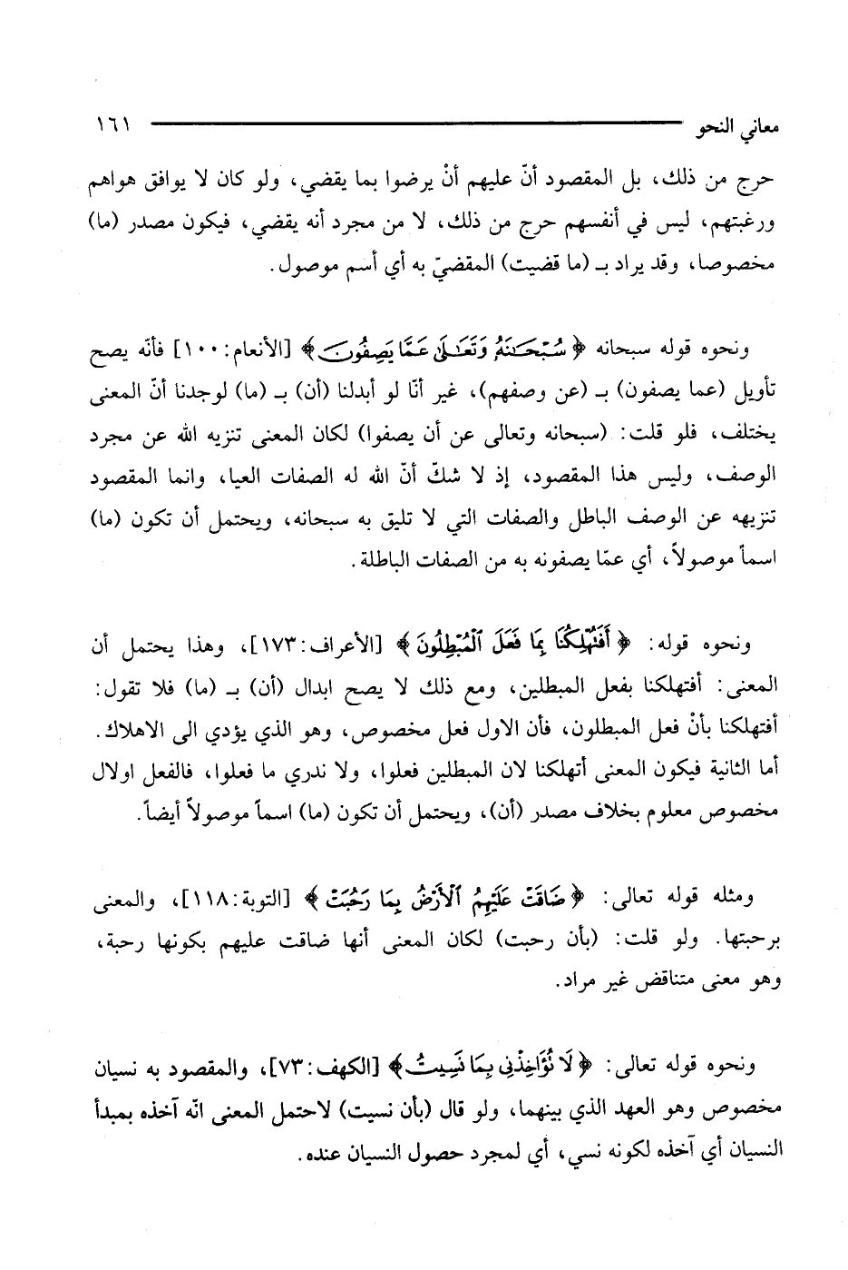 ونحوه قوله سبحانه: {سبحانه وتعالى عما يصفون} [الأنعام: 100]، فإنه يصح تأويل (عما يصفون) بـ (عن وصفهم) غير أنا لو أبدلنا (أن) بـ (ما) لوجدنا أن المعنى يختلف، فلو قلت: (سبحانه وتعالى عن أن يصفوا) لكان المعنى تنزيه الله عن مجرد الوصف، وليس هذا المقصود، إذ لا شك أن الله له الصفات العليا، وإنما المقصود تنزيهه عن الوصف الباطل والصفات التي لا تليق به سبحانه، ويحتمل أن تكون (ما) اسمًا موصولا، أي عما يصفونه به من الصفات الباطلة.