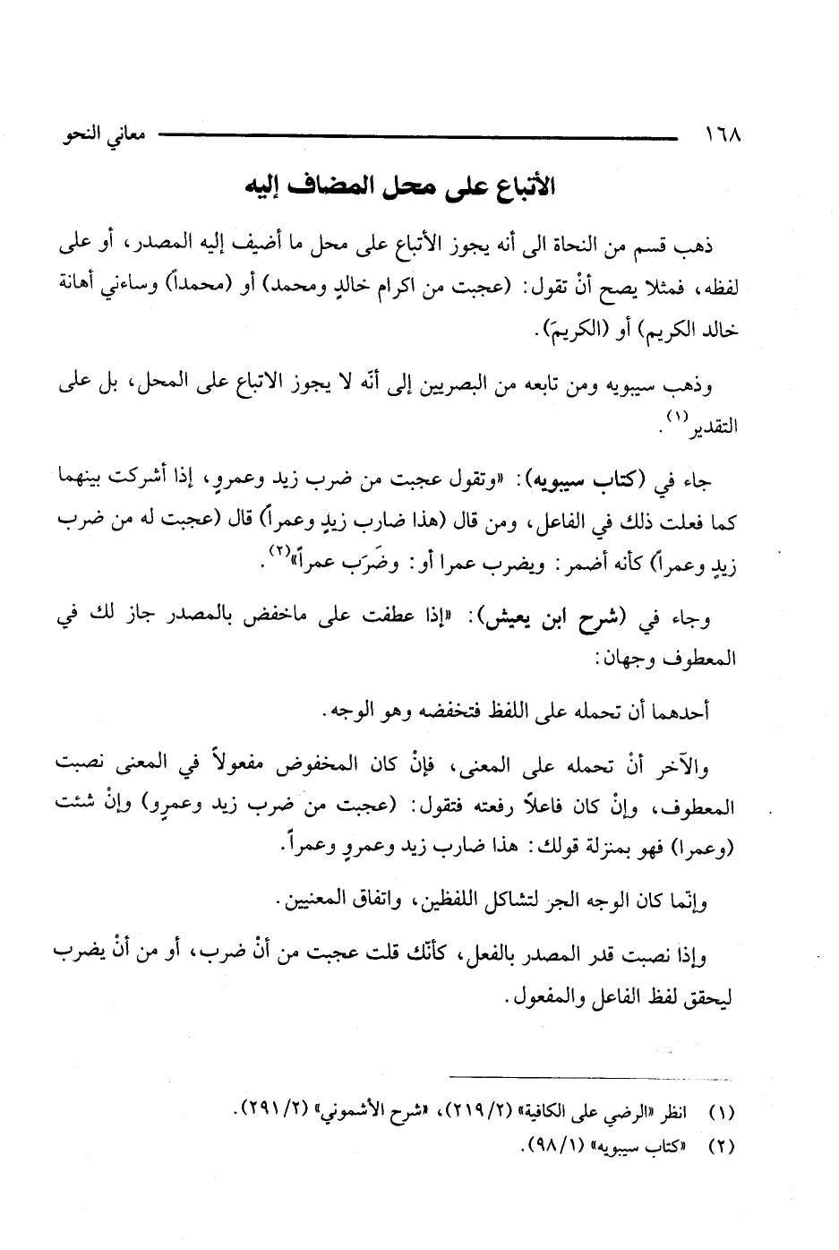 جاء في (كتاب سيبويه): " وتقول عجبت من ضرب زيد وعمرو، إذا أشركت بينهما كما فعلت ذلك في الفاعل، ومن قال (هذا ضارب زيد وعمرا) قال (عجبت له من ضرب زيد وعمرا) كأنه أضمر: ويضرب عمرا أو: وضرب عمرا (¬2).