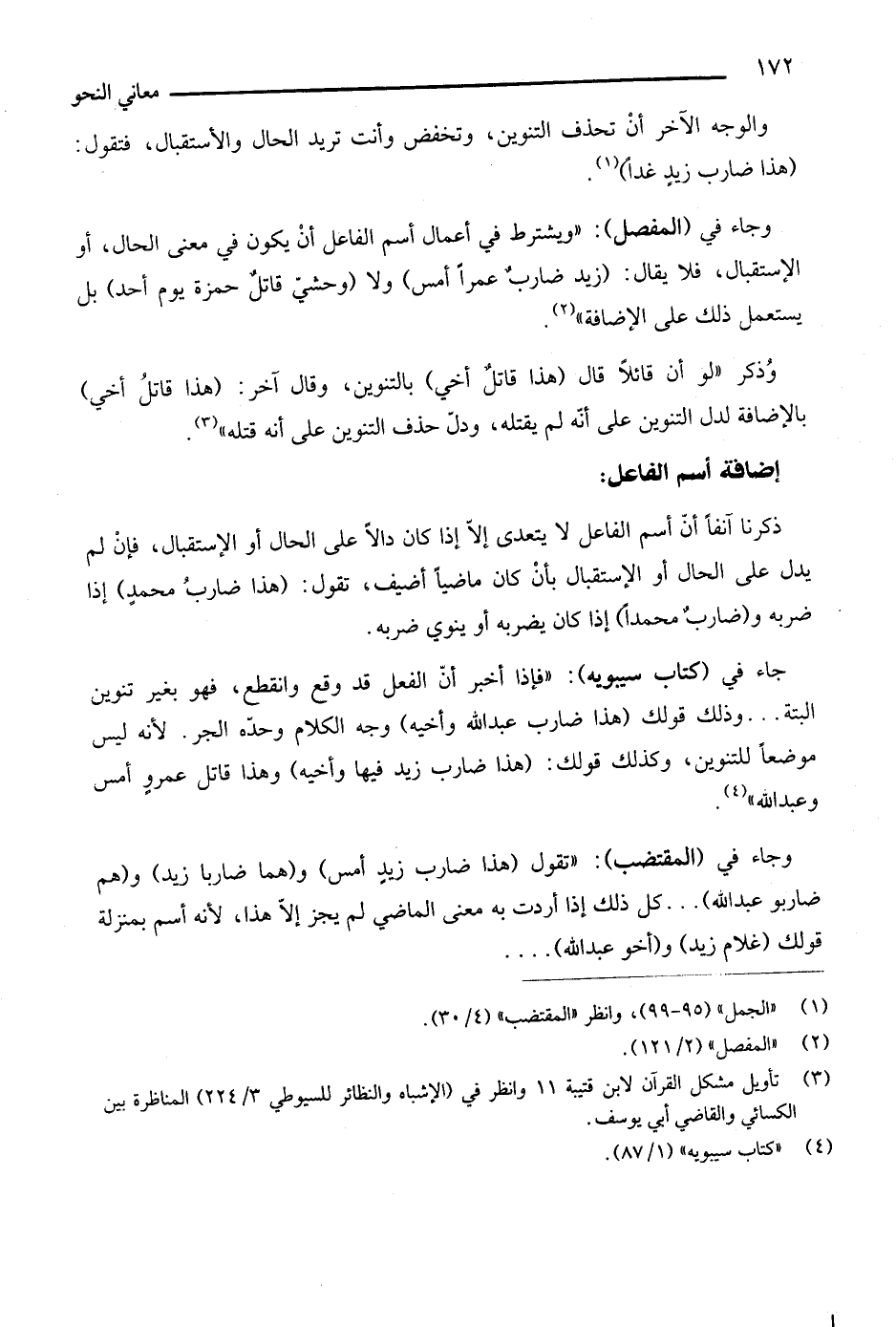 جاء في (كتاب سيبويه): " فإذا أخبر أن الفعل قد وقع وانقطع، فهو بغير تنوين البتة .. وذلك قولك (هذا ضارب عبد الله وأخيه) وجه الكلام وحده الجر. لأنه ليس موضعا للتنوين، وكذلك قولك: (هذا ضارب زيد فيها وأخيه) وهذا قاتل عمرو أمس وعبد الله" (¬4).