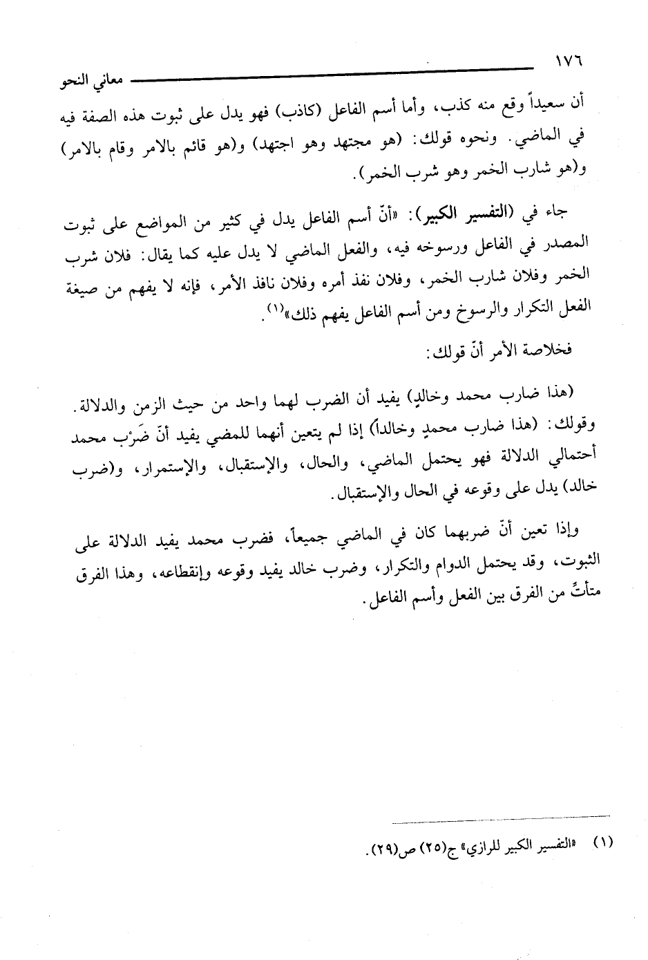 جاء في (التفسير الكبير): " أن اسم الفاعل يدل في كثير من المواضع على ثبوت المصدر في الفاعل ورسوخه فيه، والفعل الماضي لا يدل عليه كما يقال: فلان شرب الخمر وفلان شارب الخمر، وفلان نفذ أمره، وفلان نافذ الأمر، فإنه لا يفهم من صيغة الفعل التكرار والرسوخ، ومن اسم الفاعل يفهم ذلك (¬1).