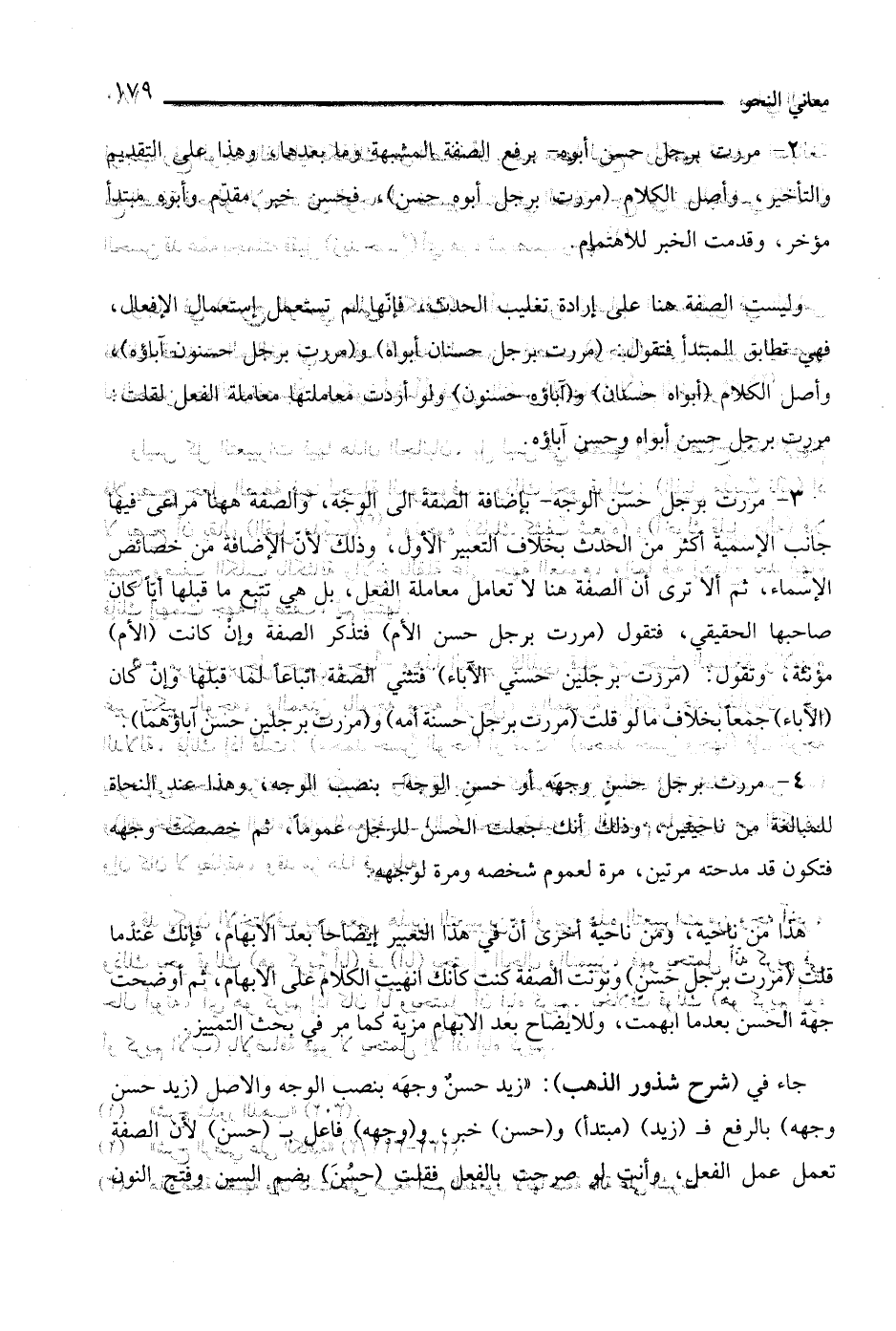 4 - مررت برجل حسن وجهه أو حسن الوجه - بنصب الوجه، وهذا عند النحاة للمبالغة من ناحيتين، وذلك أنك جعلت الحسن للرجل عمومًا، ثم خصصت وجهه فتكن قد مدحته مرتين، مرة لعموم شخصه ومرة لوجهه.