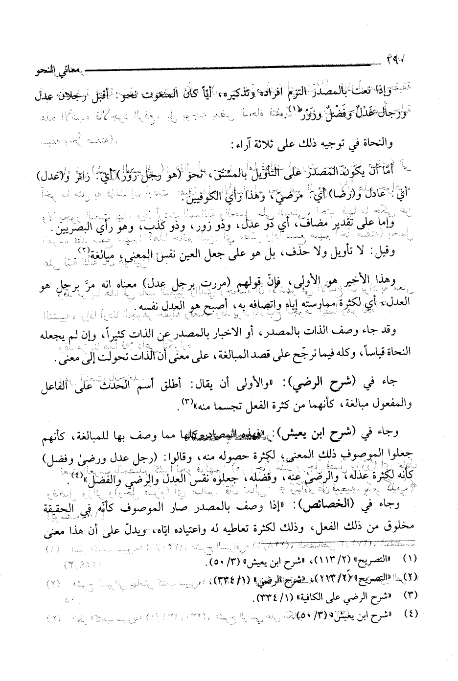 وجاء في (شرح ابن يعيش): " فهذه المصادر كلها مما وصف بها للمبالغة، كأنهم جعلوا الموصوف لك المعنى: لكثرة حصوله منه، وقالوا: (رجل عدل ورضي وفضل) كأنه لكثرة عدله، والرضي عنه، وفضله جعلوه نفس العدل والرضي والفضل (¬4).