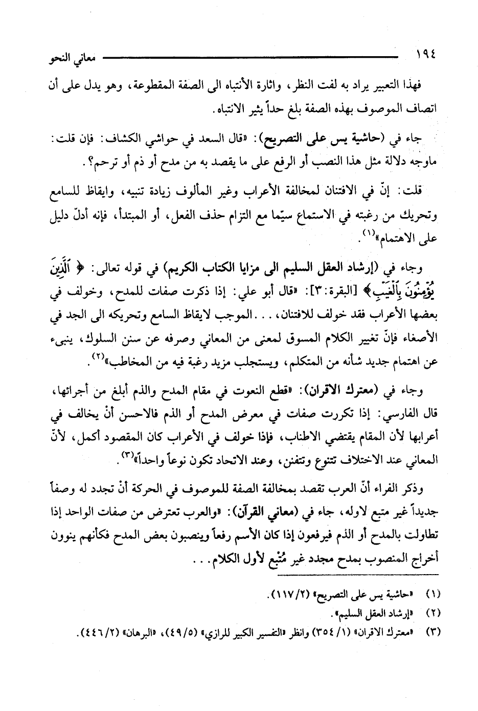وجاء في (إرشاد العقل السليم إلى مزيا الكتاب الكريم) في قوله تعالى: {الذين يؤمنون بالغيب} [البقرة: 3]، " قال أبو علي: إذا ذكرت صفات المدح، وخولف في بعضها الإعراب فقد خولف للافتنان، .. الموجب لإيقاظ السامع وتحيكه إلى الجد في الإصغاء فإن تغيير الكلام المسوق لمعنى من المعاني وصرفه عن سنن السلوك، ينبيء عن اهتمام جديد شأنه من المتكلم، ويستجلب مزيد رغبة فيه من المخاطب (¬2).
