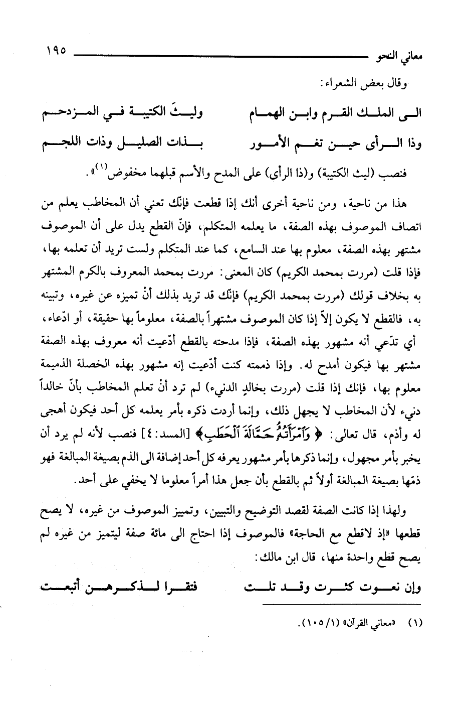 هذا من ناحية، ومن ناحية أخرى أنك إذا قطعت فإنك تعني أن المخاطب يعلم من اتصاف الموصوف بهذه الصفة، ما يعلمه المتكلم، فإن القطع يدل على أن الموصوف مشتهر بهذه الصفة، معلوم بها عند السامع، كما عند المتكلم ولست تريد ان تعلمه بها، فإذا قلت (مررت بمحمد الكريم) كان المعنى: مررت بمحمد المعروف بالكر المشتهر به بخلاف قولك (مررت بمحمد الكريم) فإنك قد تريد بذلك أن تميزه عن غيره، وتبينه به، فالقطع لا يكون إلا إذا كان الموصوف مشتهرا بالصفة، معلوما بها حقيقة أو ادعاء أي تدعي أنه مشهور بهذه الصفة، فإذا مدحته بالقطع ادعيت أنه معروف بهذه الصفة مشتهر بها فيكون أمدح له. وإذا ذممته كنت ادعيت أنه مشهور بهذه الخصلة الذميمة معلوم بها، فإنك قلت (مررت بخالد الدنيء) لم ترد أن تعلم المخاطب بأن خالدا دنيء لأن المخاطب لا يجهل ذلك، وإنما أردت ذكره بأمر يعلمه كل أحد فيكون اهجي له، وأذم، قال تعالى: {وامرأته حمالة الحطب} [المسد: 4]، فنصب لأنه لم يرد أن يخبر بأمر مجهول، وإنما ذكرها بأمر مشهور يعرفه كل أحد إضافة إلى الذم بصيغة المبالغة فهو ذمها بصيغة المبالغة أولا ثم بالقطع بأن جعل هذا أمرًا معلوما لا يخفى على أحد