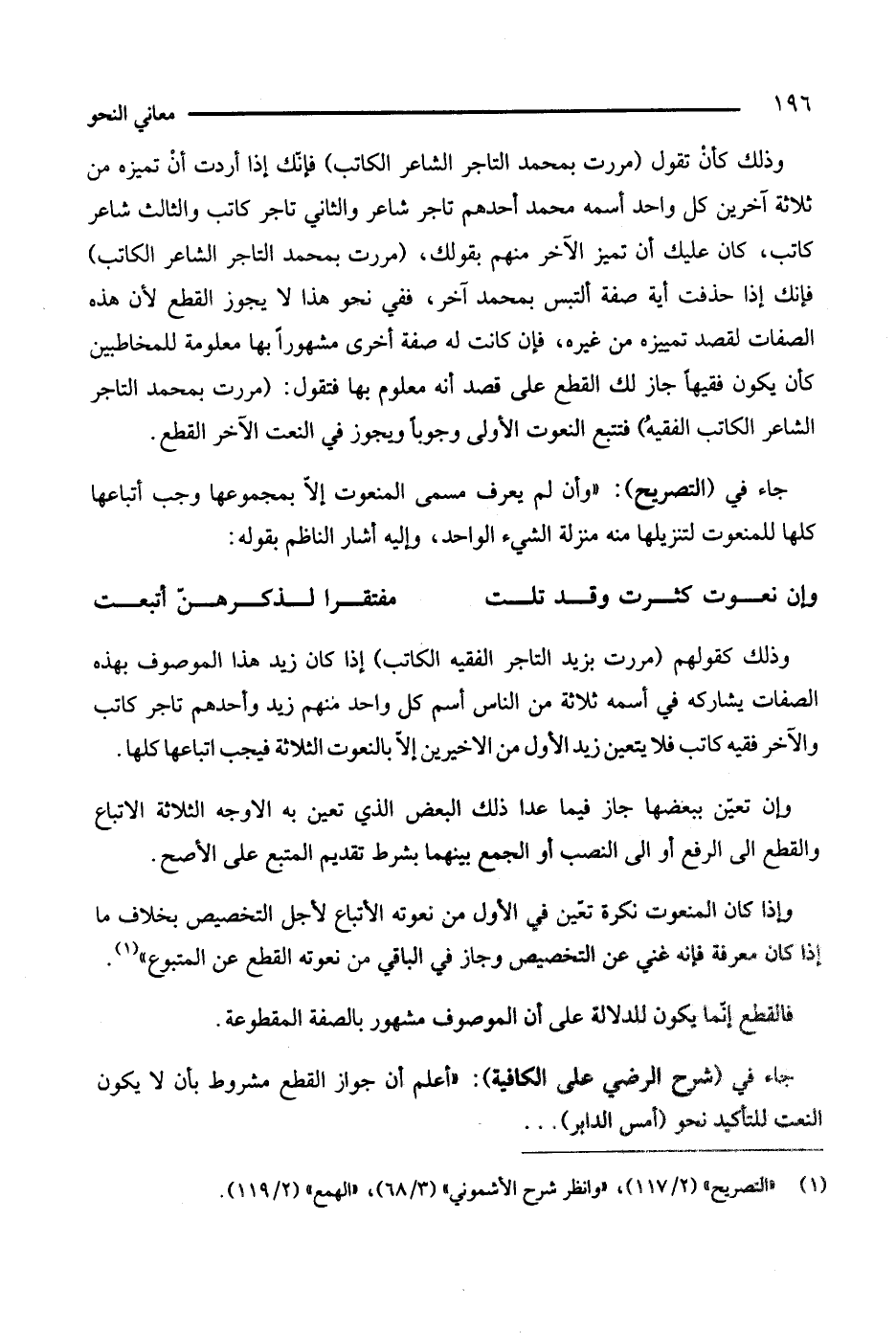 وذلك كأن تقول (مررت بمحمد التاجر الشاعر الكاتب) فإنك إذا أردت أن تميزه من ثلاثة آخرين كل واحد اسمه محمد أحدهم تاجر شاعر والثاني تاجر كاتب والثالث شاعر كاتب، كان عليك أن تميز الآخر منهم بقولك، (مررت بمحمد التاجر الشاعر الكاتب) فإنك إذا حذفت أية صفة ألتبس بمحمد آخر، ففي نحو هذا لا يجوز القطع لأن هذه الصفات لقصد تمييزه من غيره، فإن كانت له صفة أخرى مشهورا بها معلومة للمخاطبين كأن يكون فقيها جاز لك القطع على قصد أنه معلوم بها فتقول: (مررت بمحمد التاجر الشاعر الكاتب الفقيه) فتتبع النعوت الأولى وجوبا ويجوز في النعت الآخر القطع.
