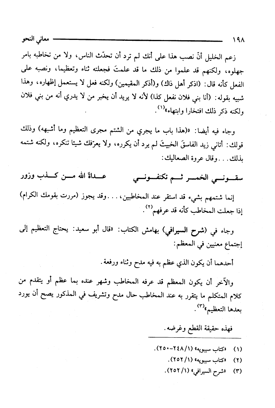 وجاء في شرح السيرافي، بهامش الكتاب: قال أبو سعيد: يحتاج التعظيم إلى إجتماع معنيين في المعظم:
