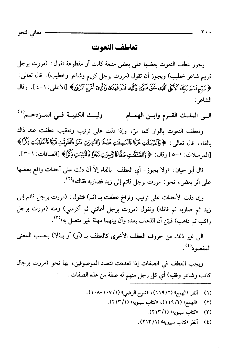 وتعطف النعوت بالواو كما مر، وإذا دلت على ترتيب وتعقيب عطفت عند ذاك بالفاء، قال تعالى: {والمرسلات عرفا فالعاصفات عصفا والناشرات نشرا فالفارقات فرقا فالملقيات ذكرا} [المرسلات: 1 - 5]، وقال: {والصافات صفا فالزاجرت زجرا فالتاليات ذكرا} [الصافات: 1 - 3].
