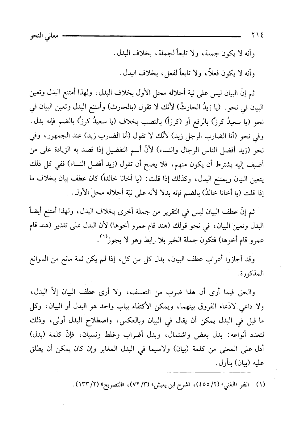ثم إن البيان ليس على نية احلاله محل الأول بخلاف البدل، ولهذا امتنع البدل وتعين البيان في نحو: (يا زيد الحارث) لأنك لا تقول: (بالحارث) وامتنع البدل وتعين البيان في نحو (يا سعيد كرز) بالرفع أو (كرزا) بالنصب بخلاف (يا سعيد كرز) بالضم فإنه بدل. وفي نحو (أنا الضارب الرجل زيد) لأنك لا تقول (أنا الضارب زيد) عند الجمهور، وفي نحو (زيد أفضل الناس الرجال والنساء) لأن اسم التفضيل إذا قصد به الزيادة على من أضيف إليه يشترط أن يكون منهم، فلا يصح أن تقول (زيد أفضل النساء) ففي كل ذلك يتعين البيان ويمتنع البدل، وكذلك إذا قلت: (يا أخانا خالدا) كان عطف بيان بخلاف ما إذا قلت (يا أخانا خالد) بالضم فإنه بدلا لأنه على نية أحلاله محل الأول