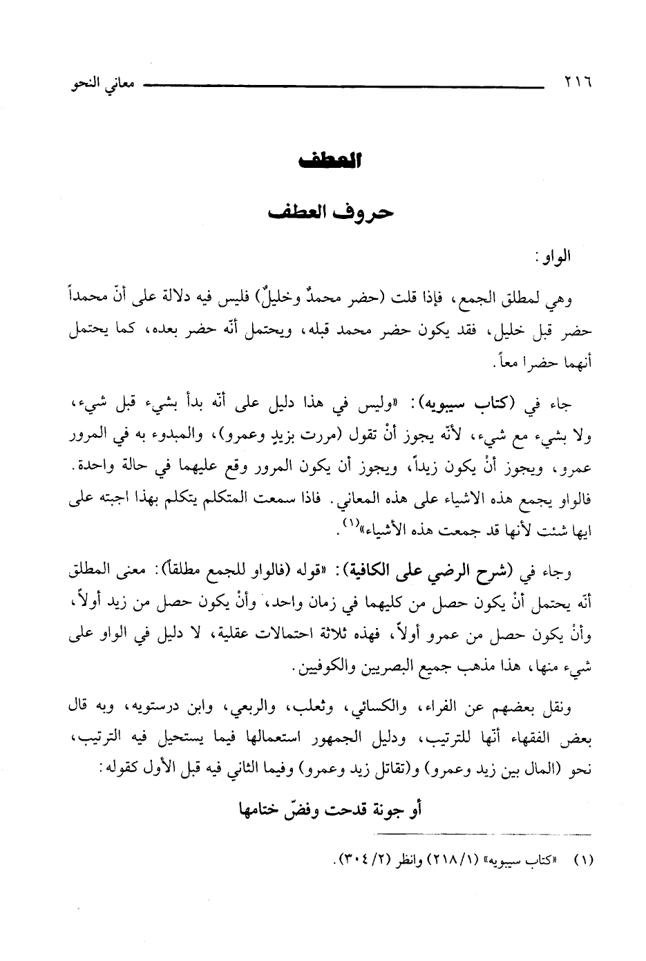 جاء في (كتاب سيبويه): " وليس في هذا دليل على أنه بدأ بشيء قبل شيء، ولا بشيء مع شيء، لأنه يجوز أن تقول (مررت بزيد وعمرو) والمبدوء في المرور عمرو، ويجوز أن يكون زيدًا، ويجوز أن يكون المرور وقع عليهما في حالة واحدة. فالواو يجمع هذه الأشياء على هذه المعاني. فإذا سمعت المتكلم يتكلم بهذا أجبته على أيها شئت لأنها قد جمعت هذه الأشياء (¬1).