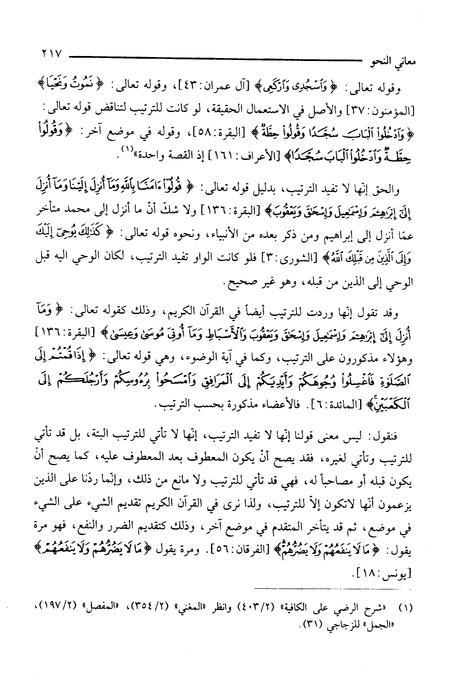 فنقول: ليس معنى قولنا أنها لا تفيد الترتيب، إنها لا تأتي للترتيب البتة، بل قد تأتي للترتيب وتأتي لغيره، فقد يصح أن يكون المعطوف بعد المعطوف عليه، كما يصح أن يكون قبله أو مصاحبا له، فهي قد تأتي للترتيب ولا مانع من ذلك، وإنما ردنا على الذين يزعمون انها لا تكون إلا للترتيب، ولذا نرى في القرآن الكريم تقديم الشيء على الشيء في موضع ثم قد يتأخر المتقدم في موضع آخر، وذلك كتقديم الضرر والنفع، فهو مرة يقول: {ما لا ينفعهم ولا يضرهم} [الفرقان: 56]، ومرة يقول: {ما لا يضرهم ولا ينفعهم} [يونس: 18].