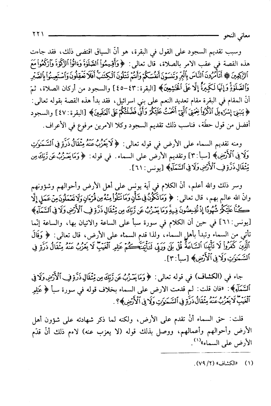 ومنه تقديم السماء على الأرض في قوله تعالى: {لا يعزب عنه مثقال ذرة في السماوات ولا في الأرض} [سبأ: 3]، وتقديم الأرض على السماء. في قوله: {وما يعزب عن ربك من مثقال ذرة في الأرض ولا في السماء} [يونس: 61].