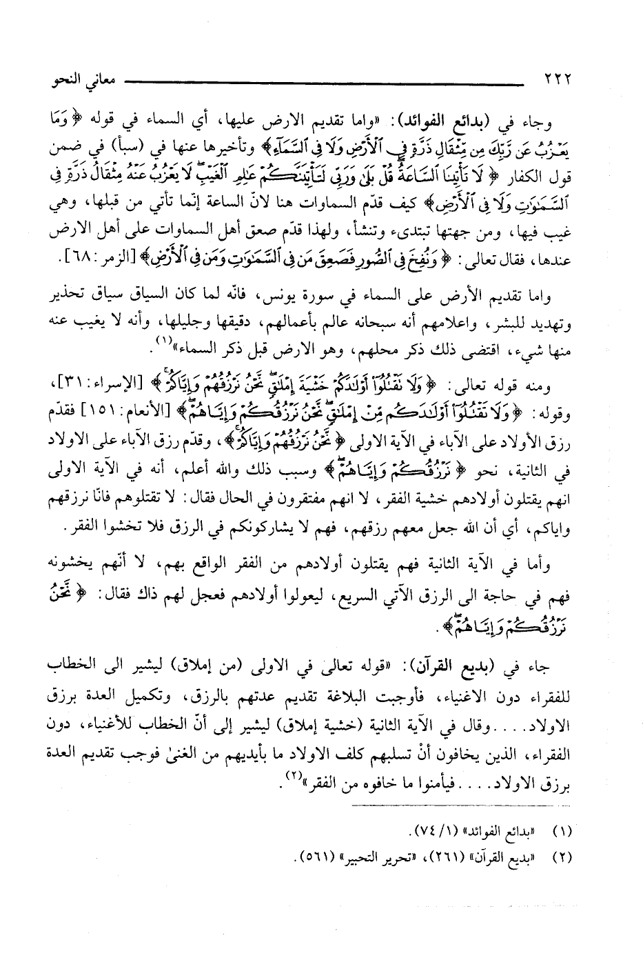 ومنه قوله تعالى: {ولا تقتلوا أولادكم خشية إملاق نحن نرزقهم وإياكم} [الإسراء: 31]، وقوله: {ولا تقتلوا أولادكم من إملاق نحن نرزقكم وإياهم} [الأنعام: 151]، فقدم رزق الأولاد على الآباء في الآية الأولى {نحن نرزقكم وإياكم}، وقدم رزق الآباء على الأولاد في الثانية، نحو {نرزقكم وإياهم} وسبب ذلك والله أعلم، أنه في الآية الأولى أنهم يقتلون اولادهم خشية الفقر، لا أنهم مفتقرون في الحال فقال: لا تقتلوهم فإنا نرزقهم وإياكم، أي أن لله جعل معهم رزقهم، فهم لا يشاركونكم في الرزق، فلا تخشوا الفقر.