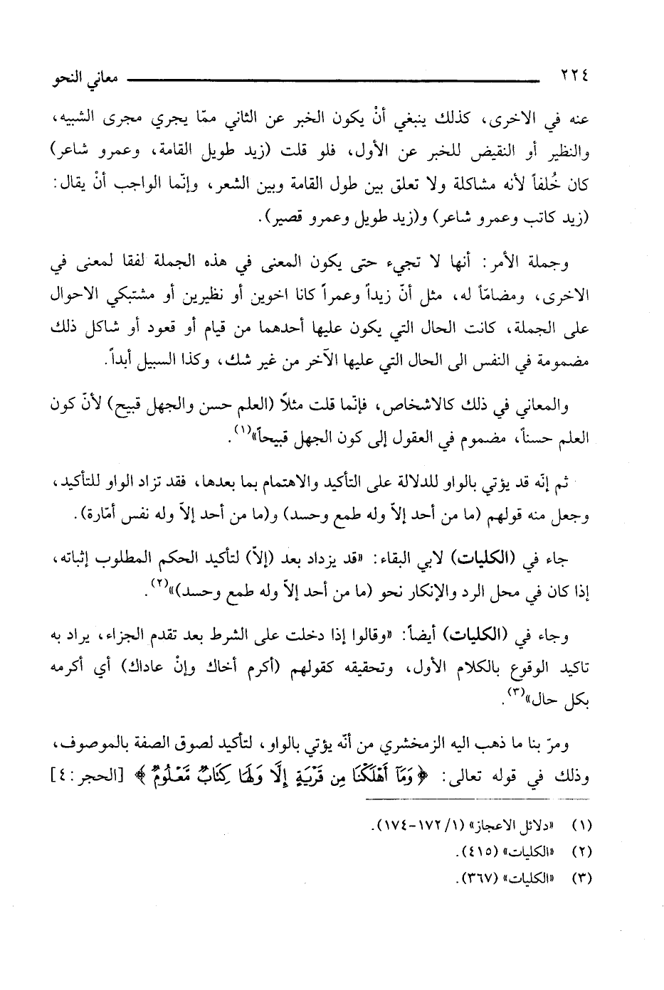 ومر بنا ما ذهب إليه الزمخشري من أنه يؤتى بالواو، لتأكيد لصوق الصفة بالموصوف وذلك في قوله تعالى: {وما أهلكنا من قرية من قرية إلا ولها كتاب معلوم} [الحجر: 4]
