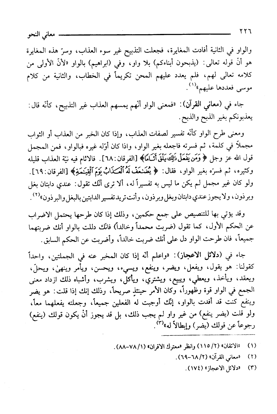 ومعنى طرح الواو كأنه تفسير لصفات العذاب، وإذا كان الخبر من العذاب أو الثواب مجملا في كلمة، ثم فسرته فاجعله بغير الواو، وإذا كان أوله غيره فبالواو، فمن المجمل قول الله عز وجل: {ومن يفعل ذلك يلق أثاما} [الفرقان: 68]، فالأثام فيه نية العذاب قليلة وكثيره، ثم فسره بغير الواو، فقال: {يضاعف له العذاب يوم القيامة} [الفرقان: 69] ولو كان غير مجمل لم يكن ما ليس به تفسيرا له، ألا ترى أنك تقول: عندي دابتان بقل وبردون، ولا يجوز عندي دابتان وبغل وبرذون، وأنت تريد تفسير الدابتين بالبغل والبرذون (¬2).